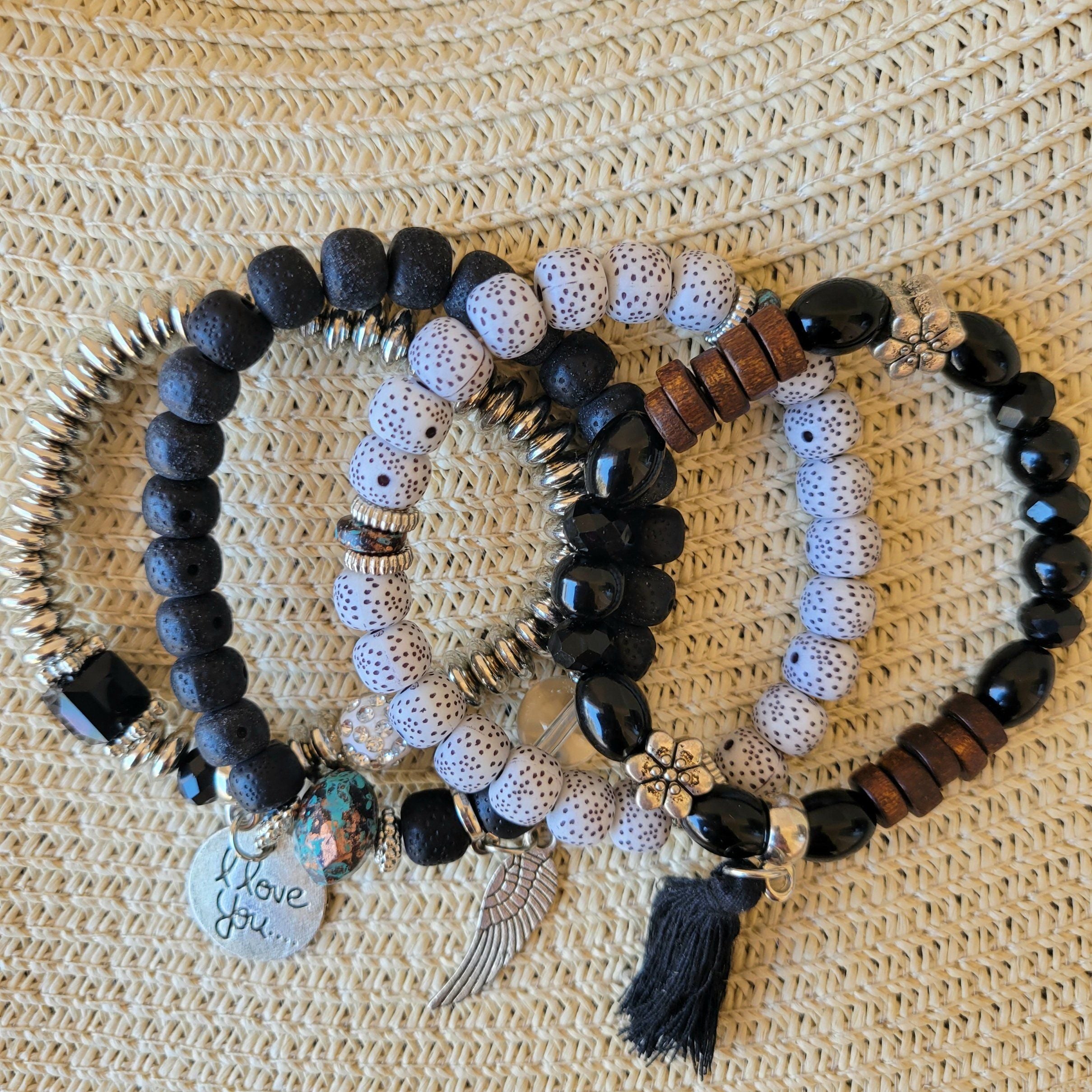 Vibrant, tasseled, beaded layering bracelIets will delight and briIng enjoyment for that special person in your life, complete with an “I love you” metallic disc to show that you care. All four bracelets are wrapped in a black organza jewelry bag ready to gift.