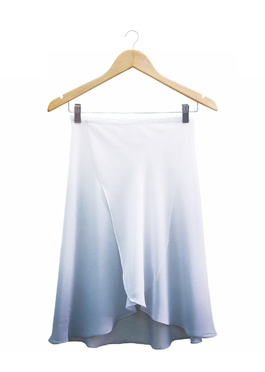 This ethereal wrap skirt skirt gracefully transitions from pristine white to subtle grey, embodying the elegance of classical ballet.