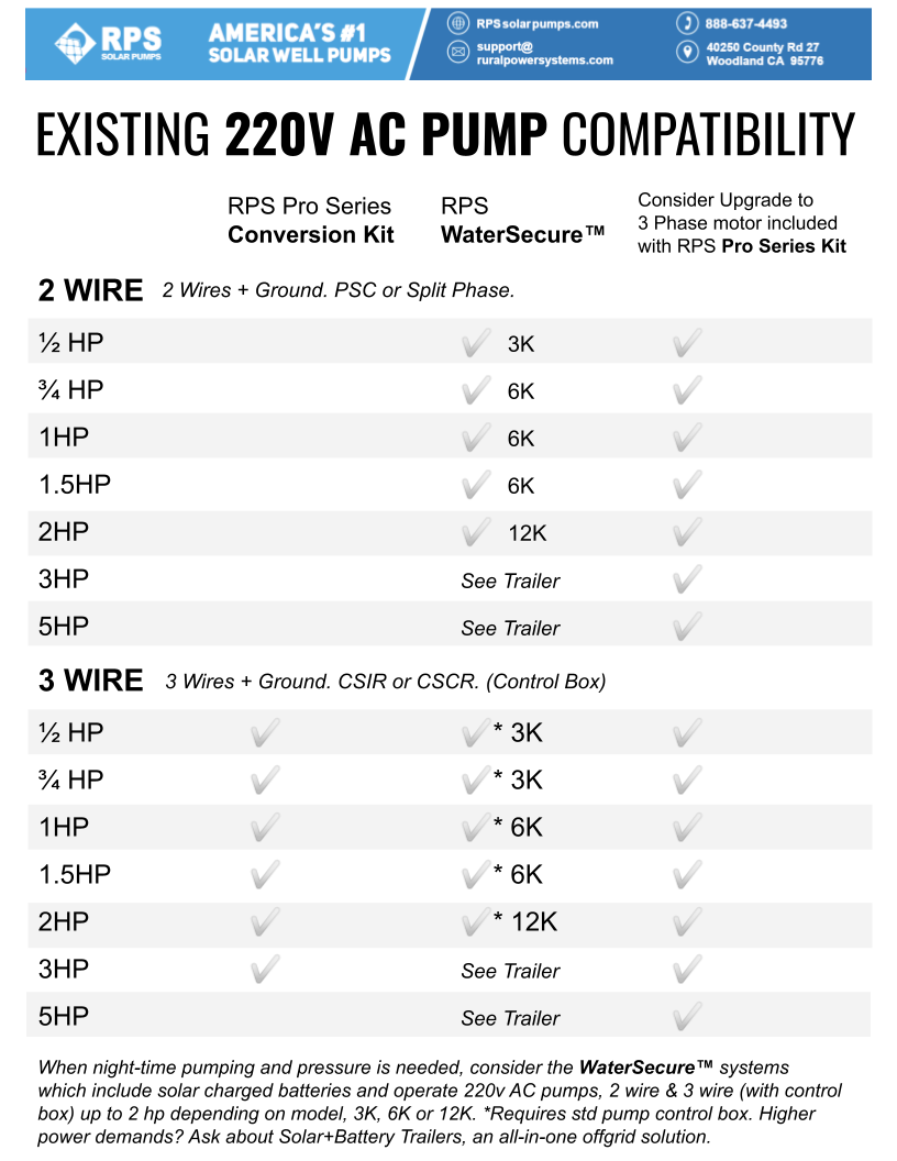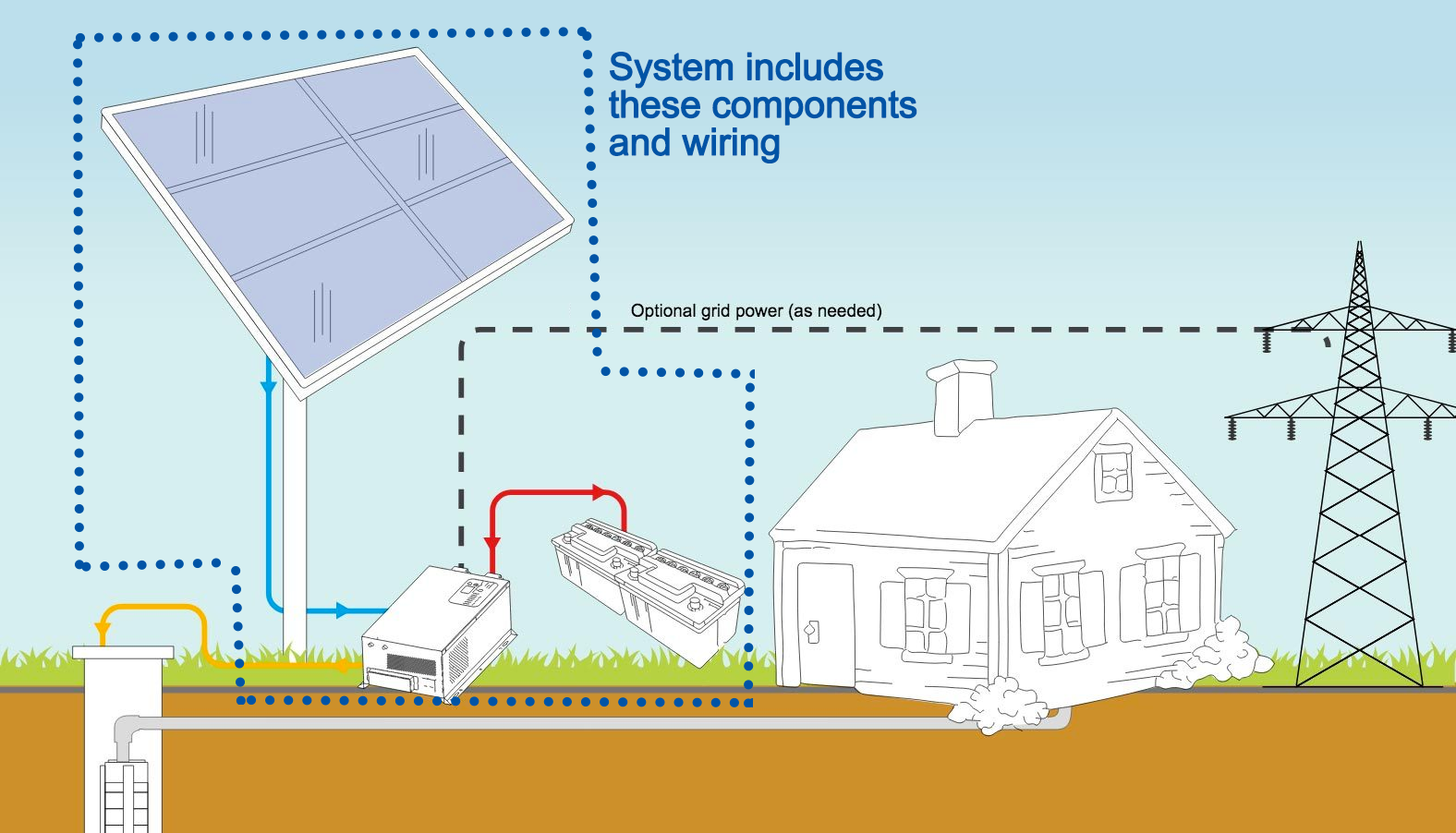 System is near universal with any traditional AC well pump motor, but let our engineers know if you have a question on compatibility. No pump? It will also work as an AC power system for off-grid home or cabin. Solar panel mounting is not included, visit our Pole Mounting or Scalable Ground Mounting pages for more info on mounting your solar panels.