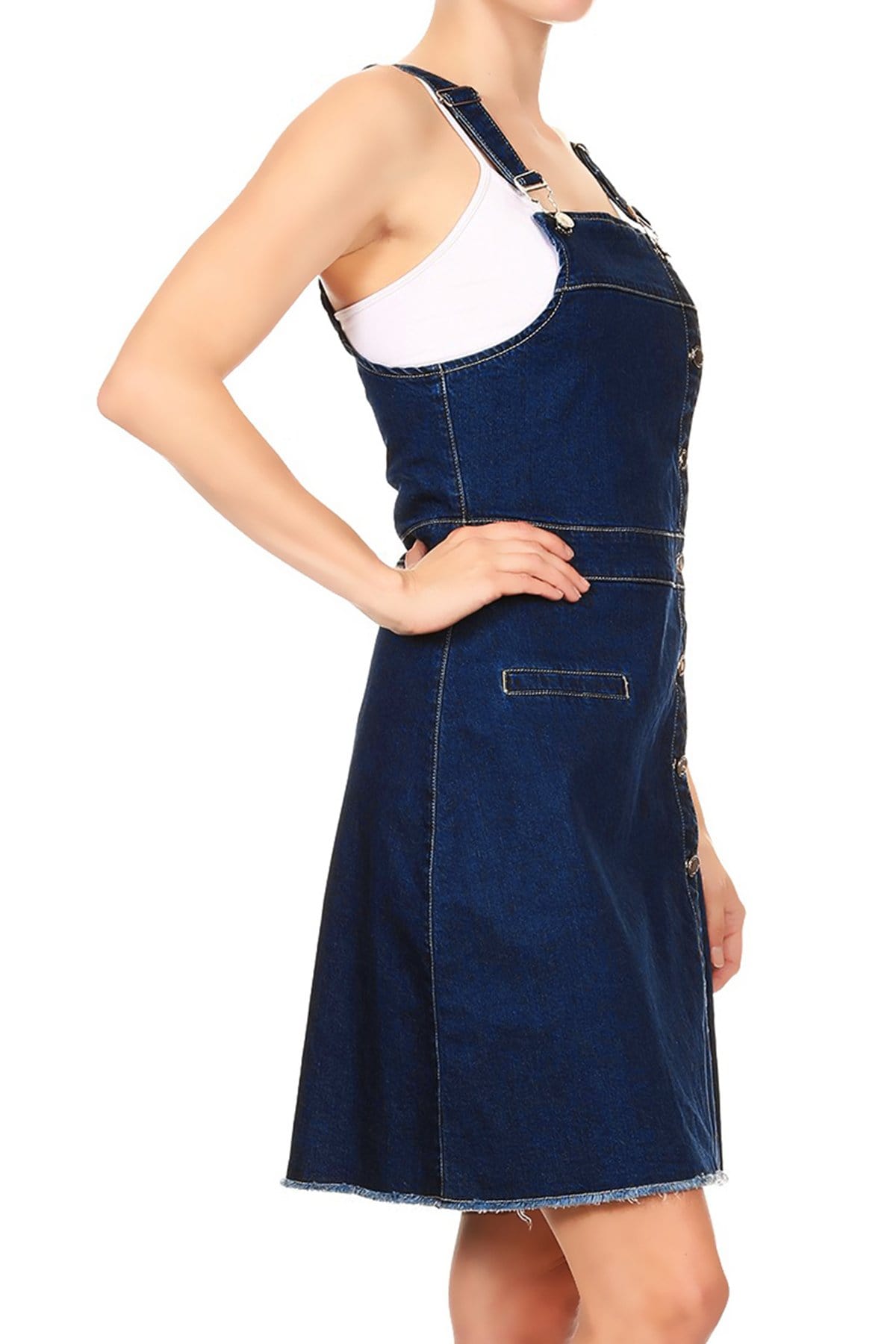 - TRENDY DENIM OVERALL DRESS. Short dark wash denim dress with adjustable shoulder straps. Side front button detail with 10 inch slit above the knee. Silver exposed buttons with Bold contrasting thread stitching throughout and mild Distressing along sk