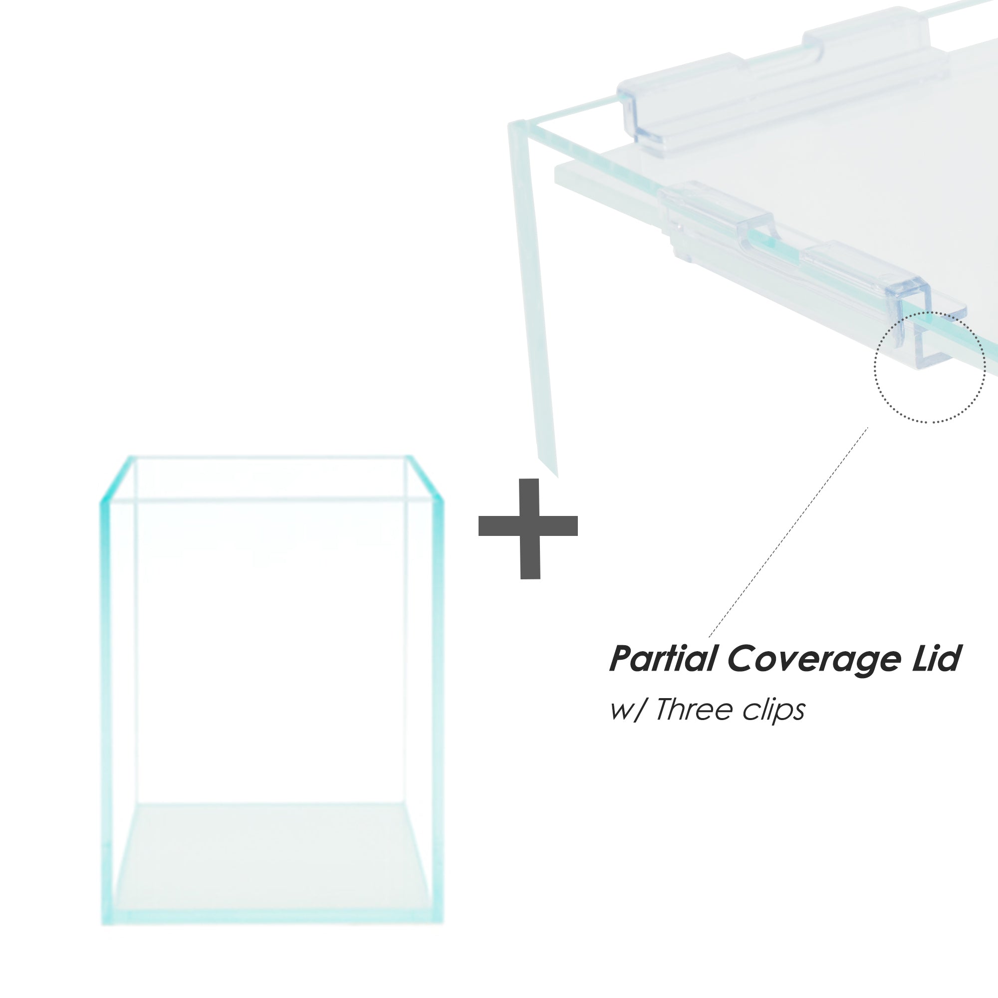 * Partial coverage lid - it comes with three acrylic clips. With it covered on top, there is still little space left for you to put on a hang-on filter or hoses.