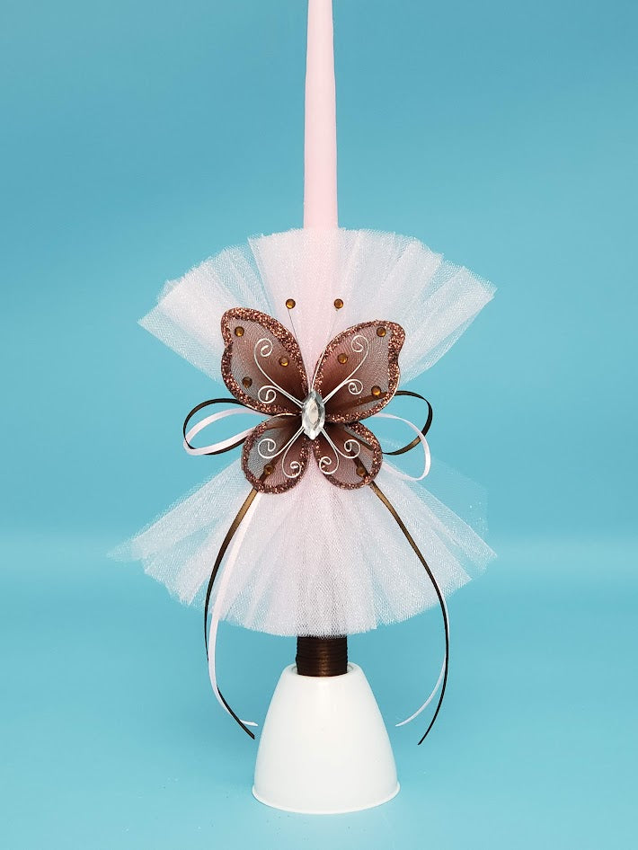 Decorated with bunch of light pink tulle and cinched in the middle. A chocolate organza butterfly adorns the center and streamer ribbons hang down gracefully. Chocolate colored satin roping wraps around the candle stem at the base.