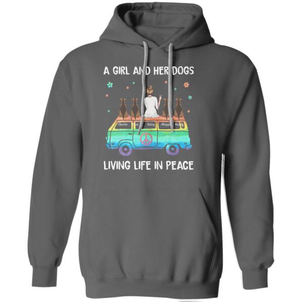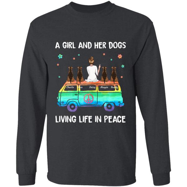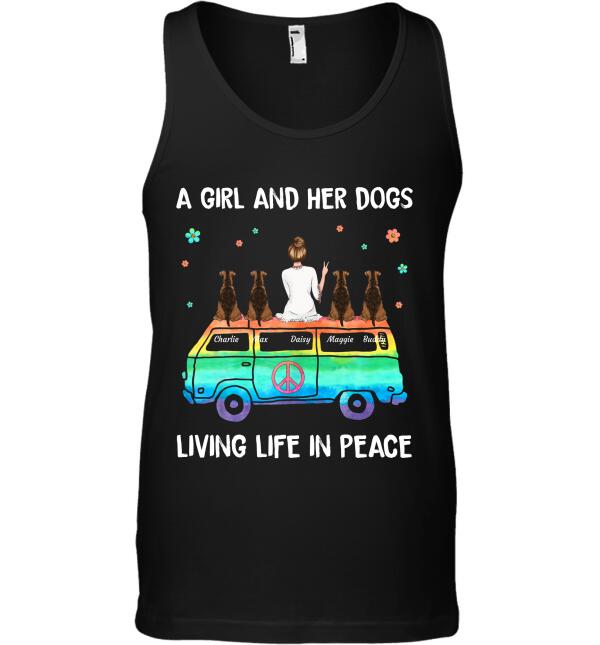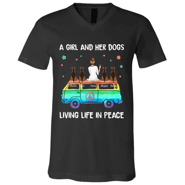 "A Girl And Her Dogs, Cats Living Life In Peace" Pink girl dog, cat personalized T-Shirt