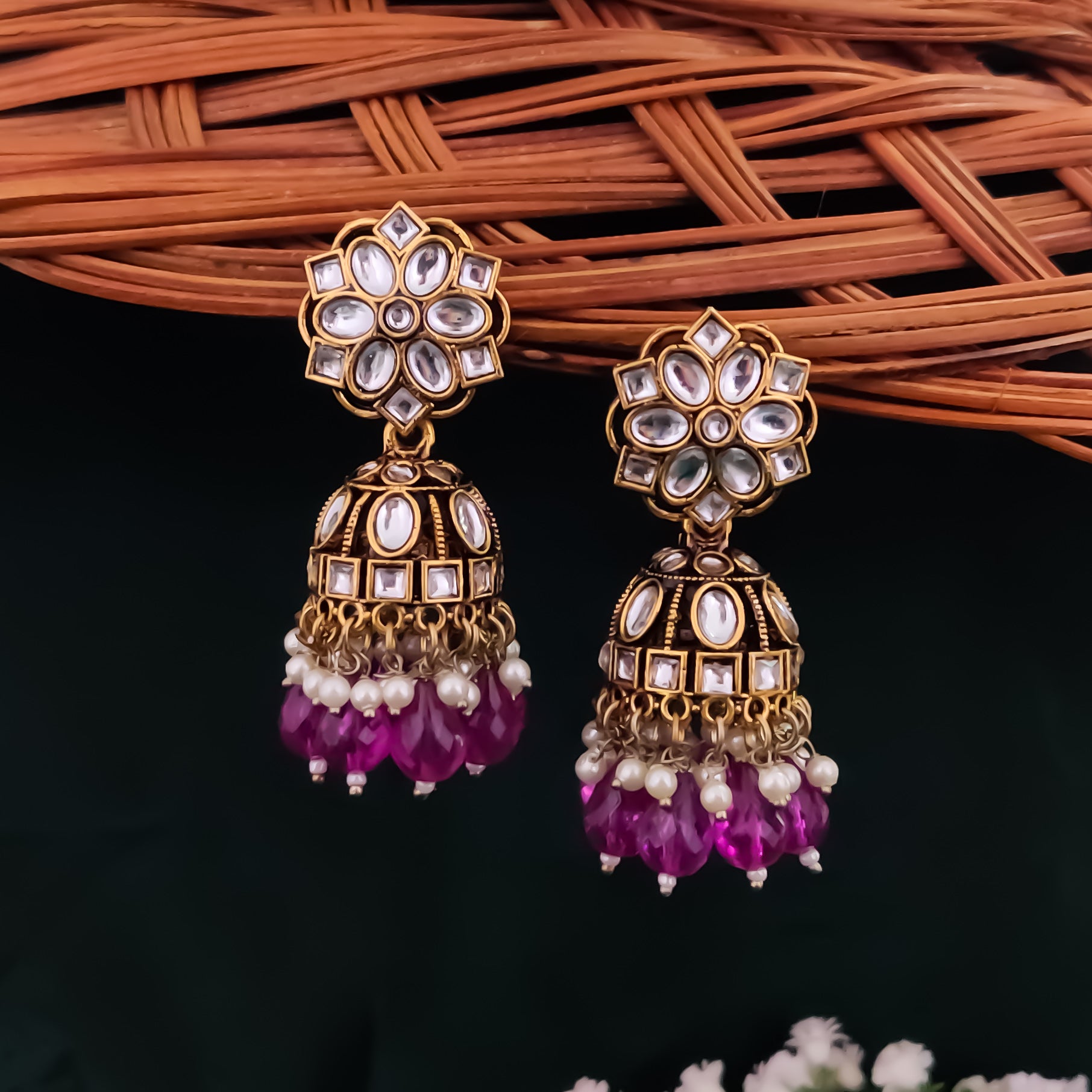 Elevate your elegance with our Aashika Pearl Jhumka Earrings. Featuring intricate detailing and a cascade of delicate pearls, these earrings blend timeless tradition with modern charm. Perfect for any occasion, they add a touch of grace and sophistication to your ensemble.
