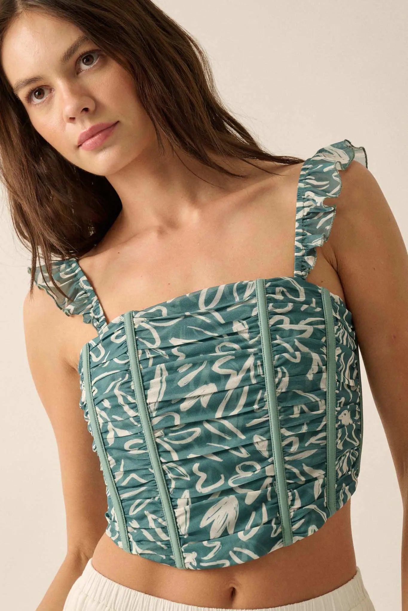 Abstract Blooms Floral-Print Mesh Corset Cami Top