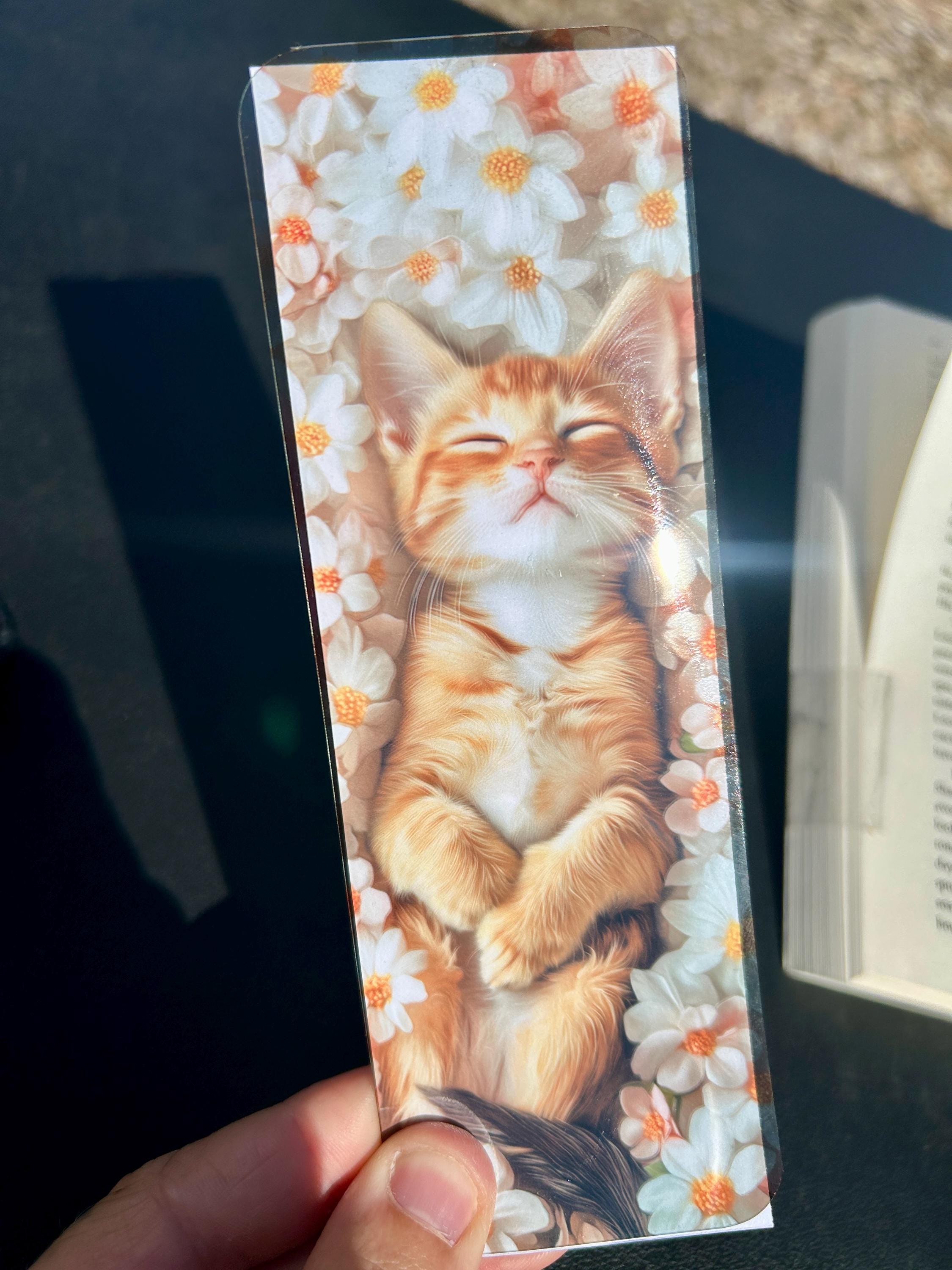 Adorable Sleeping Orange Tabby Kitten Bookmark with Floral Background – Cute Cat Bookmark