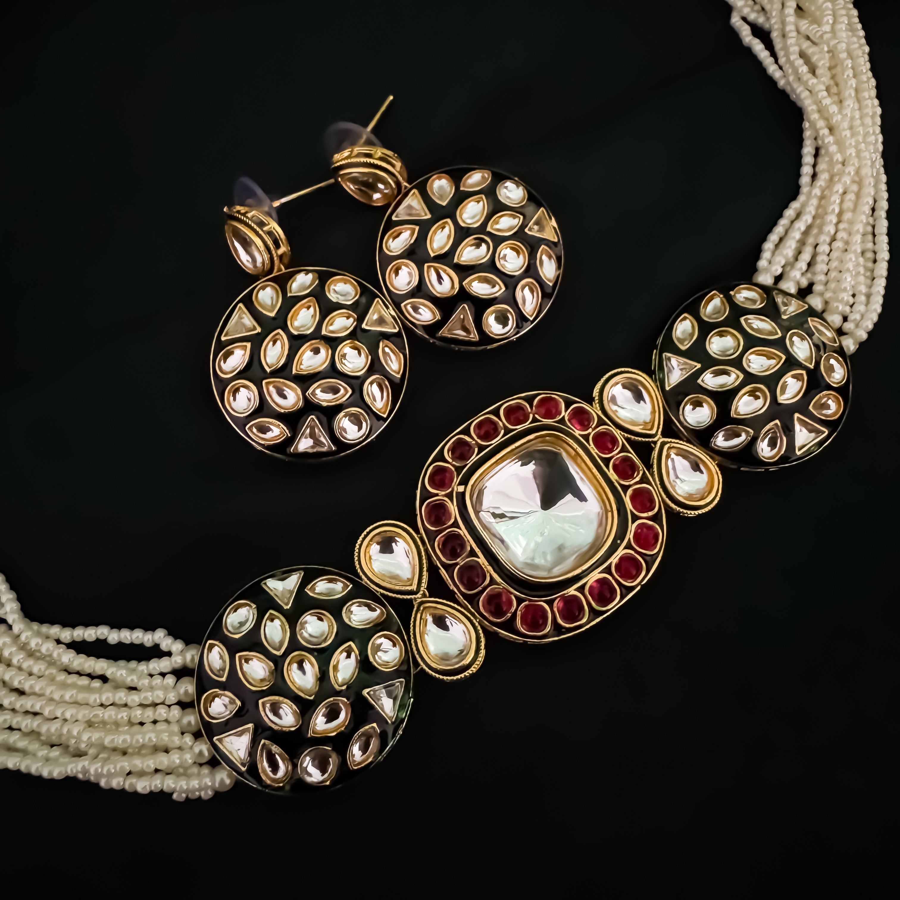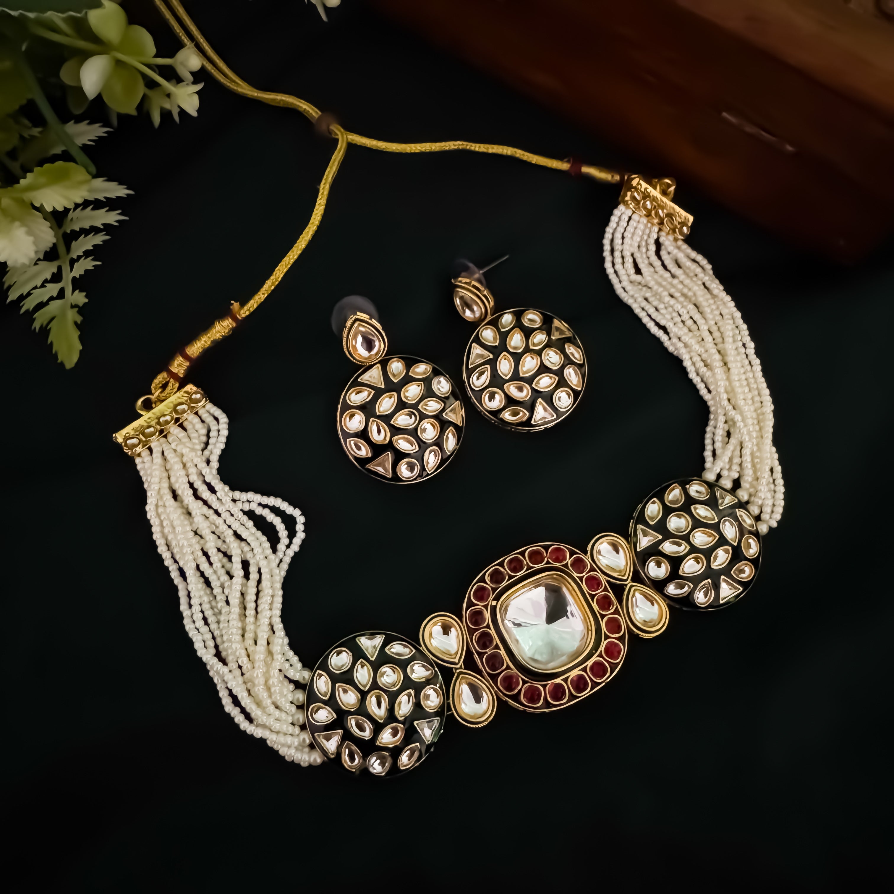 The Advita Vilandi Kunadn Necklace Set is a stunning fusion of elegance and tradition. Featuring radiant Kundan stones paired with delicate pearls, this set adds a touch of regal charm to any outfit. Perfect for weddings or festive occasions, it’s designed to make you stand out with timeless grace.