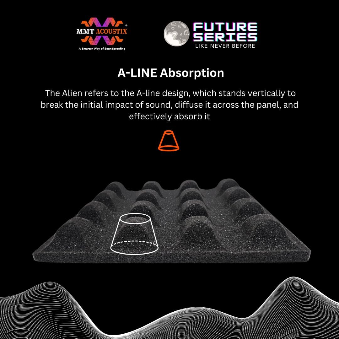 Introducing the Alien Acoustic Foam, a standout feature of the Design of the Future Series, offering advanced soundproofing with its innovative A-line design. This design vertically disrupts sound waves, diffusing and absorbing them effectively. Certified by ARAI and meeting ASTM C423 standards, the foam boasts a high Noise Reduction Coefficient (NRC) of 0.90, making it ideal for environments requiring superior sound control. Versatile in installation, it adheres easily to a variety of surfaces, including wood, plaster, and metal. Its sleek, modern look enhances any space, perfect for studios, theatres, and more, blending top-notch performance with premium aesthetics.