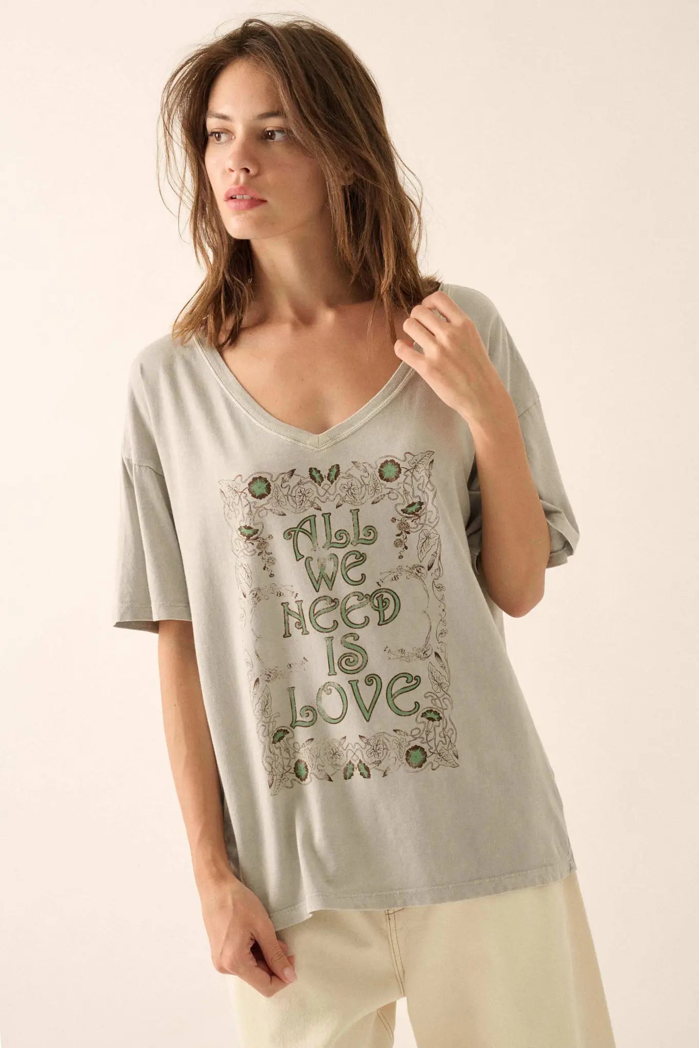 - Vintage-style "All We Need Is Love" text print with floral graphics.