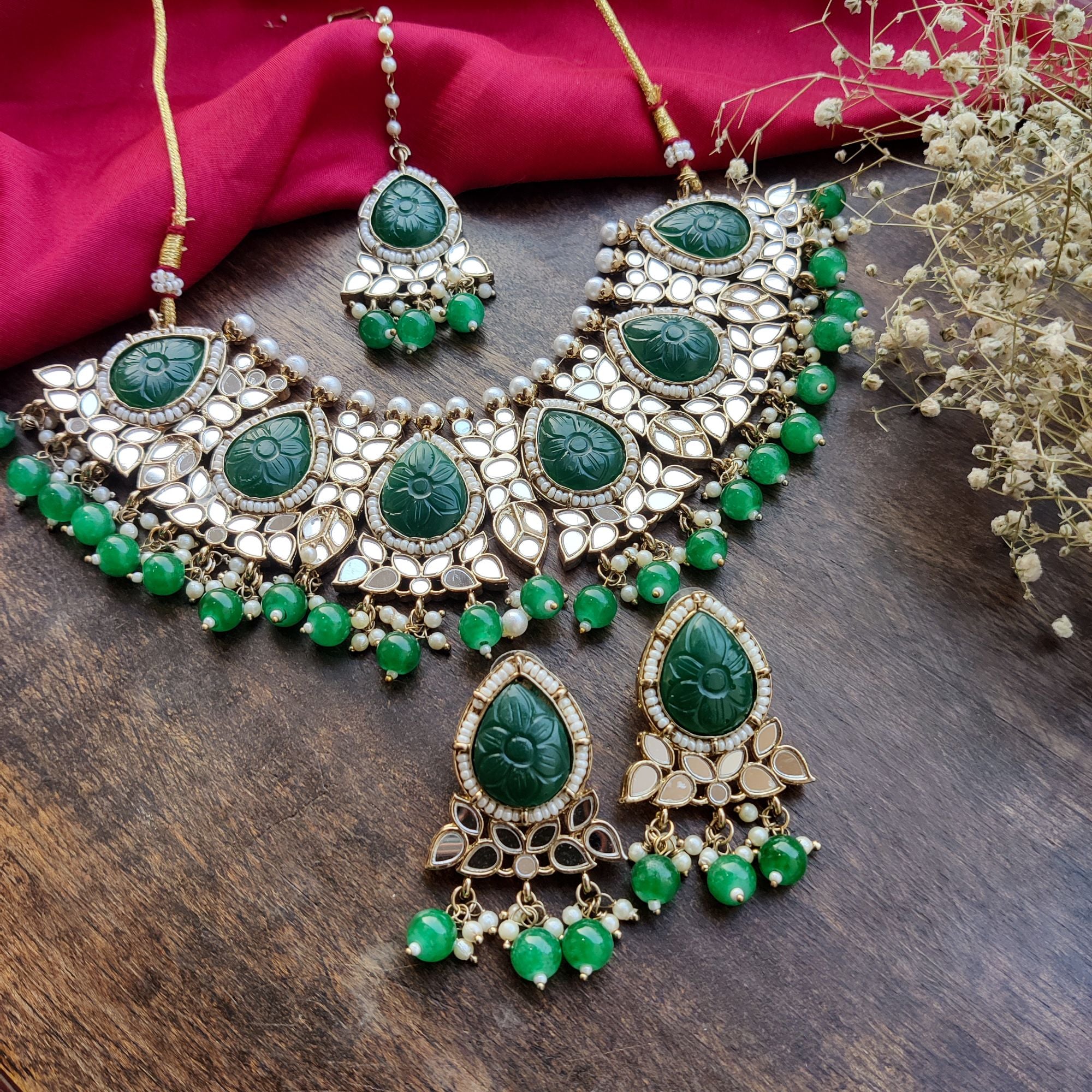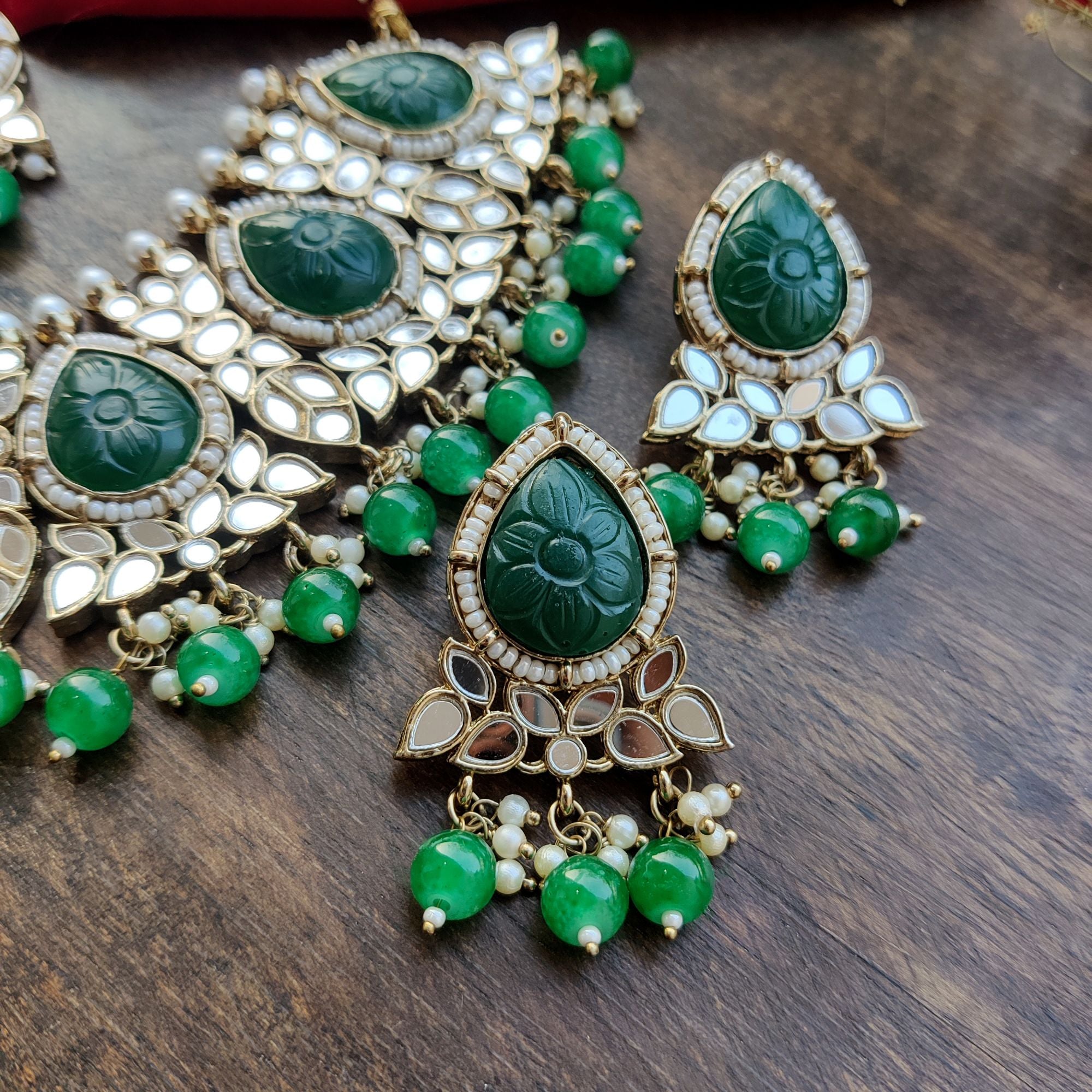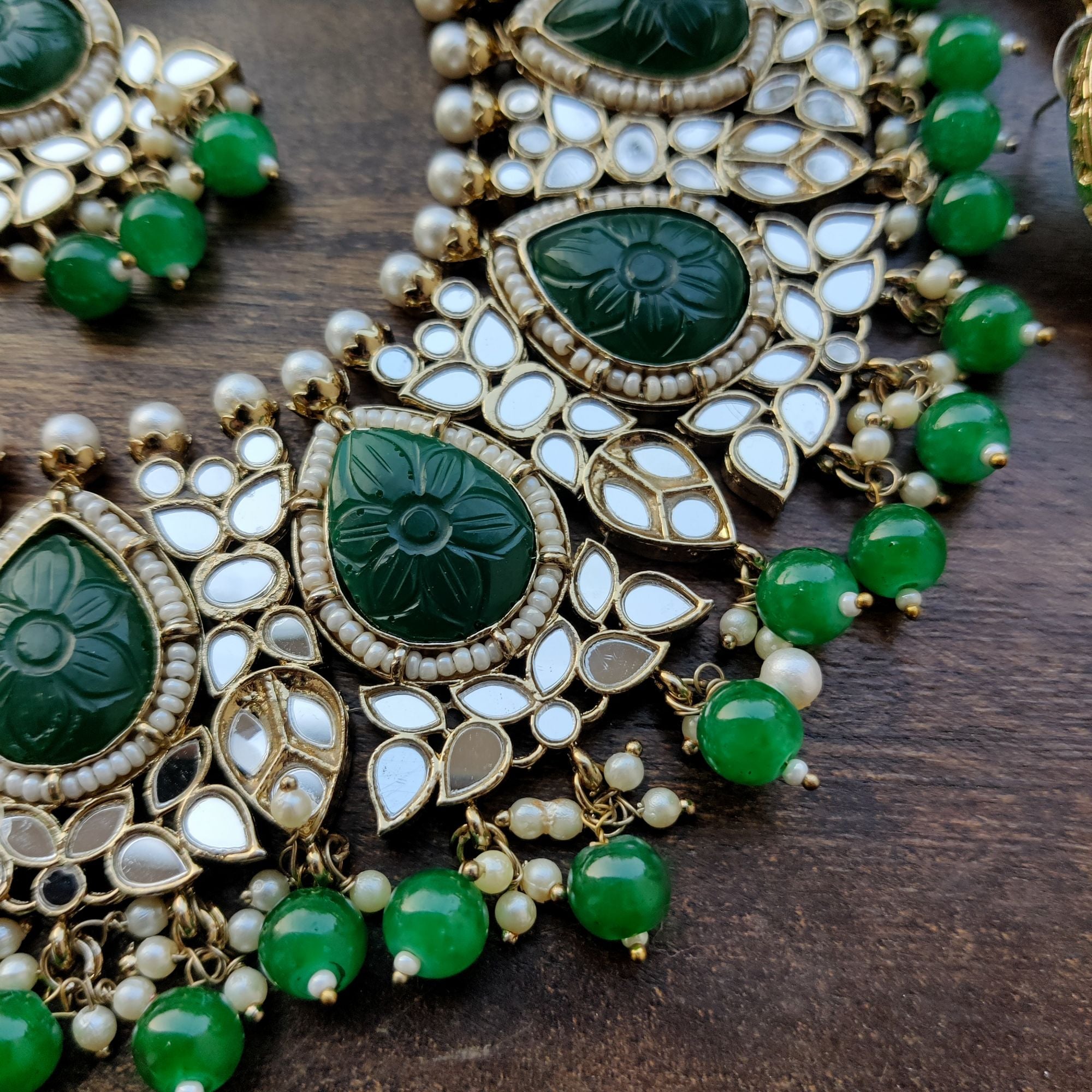 ANUPAMA MIRROR & CARVED STONE NECKLACE SET - GREEN