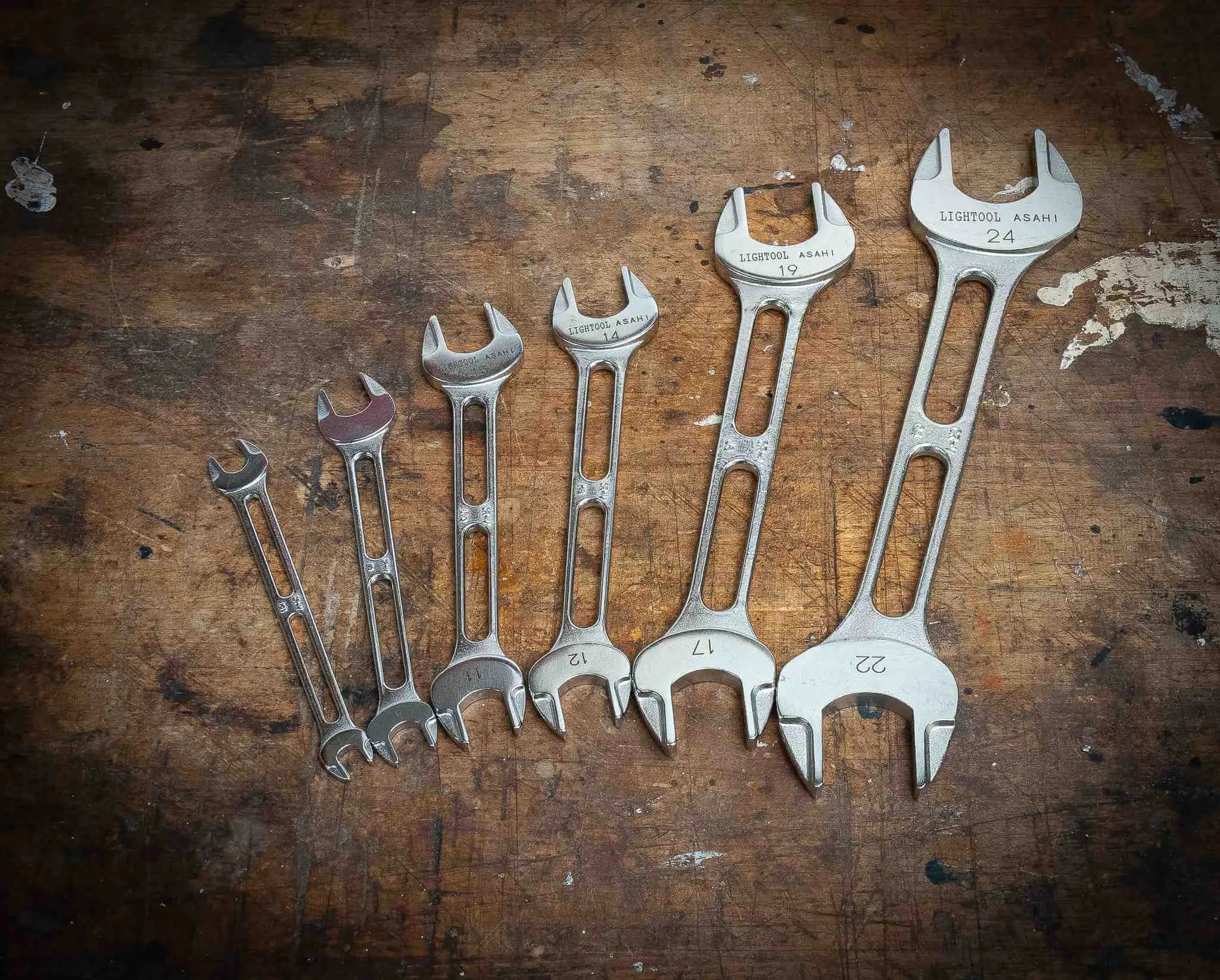 The smaller sizes of these Asahi LIGHTOOL lightweight open-end wrenches up to 14 mm are a great alternative to the expensive titanium Motion Pro TiProlight combination wrenches at a fraction of the price. This set, however, also includes larger sizes up to 24 mm.