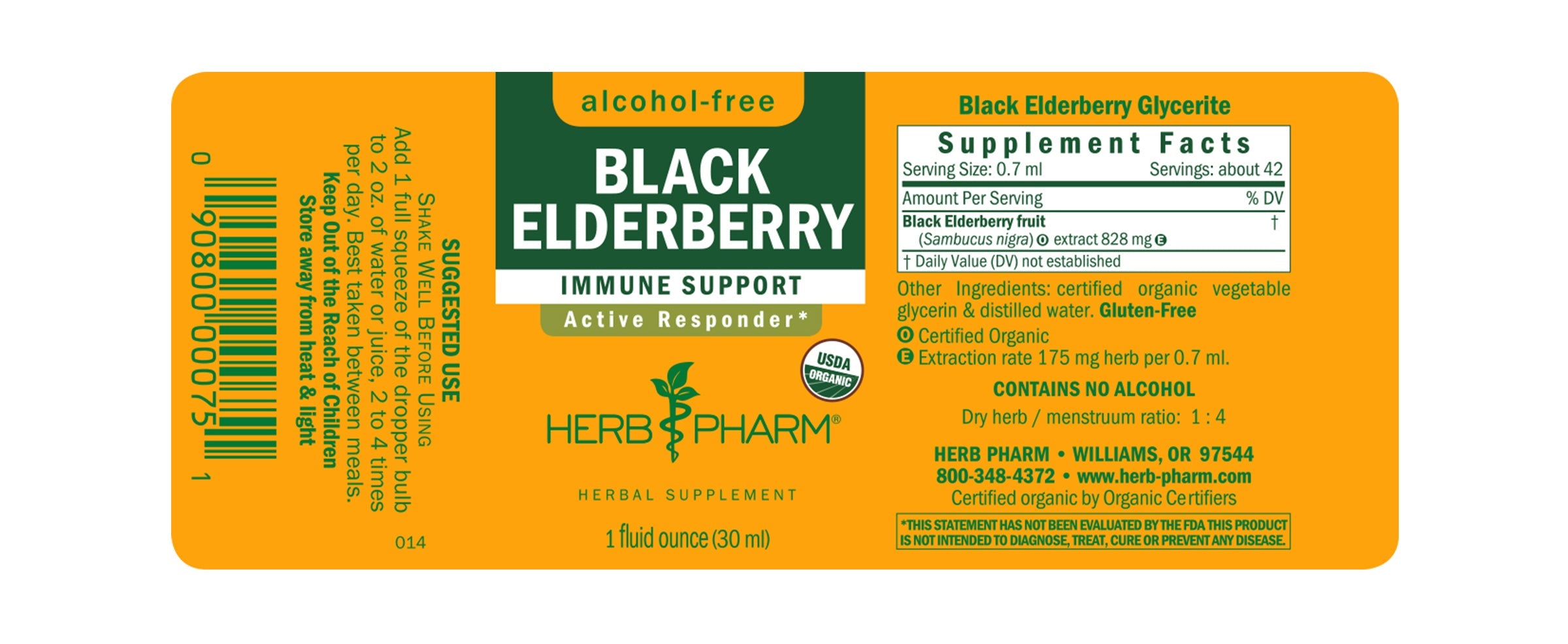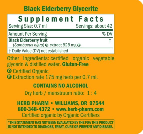 Herb-Pharm prepares Black Elderberry Glycerite from the ripe berries of Certified Organic Sambucus nigra trees. The berries are hand-harvested only when ripe to assure optimal extraction of Black Elderberry’s bioactive compounds.