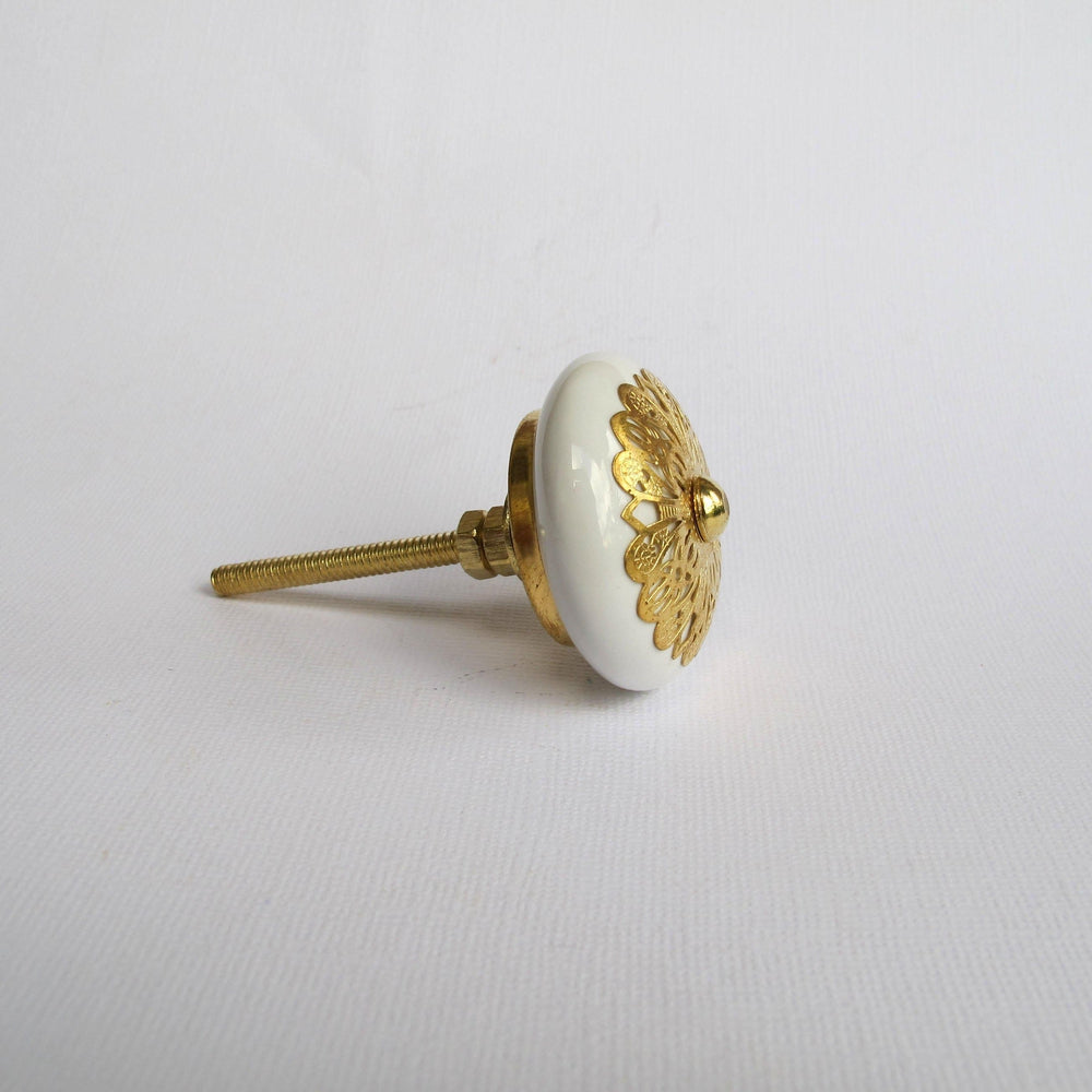 Intricate gold lace filigree design resembling butterfly wings on white ceramic round knob. Vintage style knob, classic design. Beautifully detailed, one you are sure to love! White ceramic knob with gold metal design overlay.