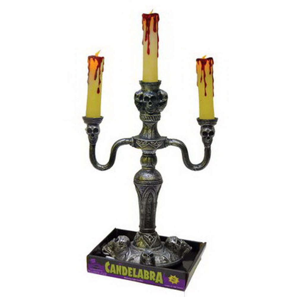 Haunted nights await with this 14" Bloody Look Candelabra! Its gothic design and skull motif will send chills down your spine, while the white candles look ready to drip blood! LED lights create a truly spooky atmosphere - just add 3 AAA batteries. Experience the creepy ambience of this unforgettable decoration!