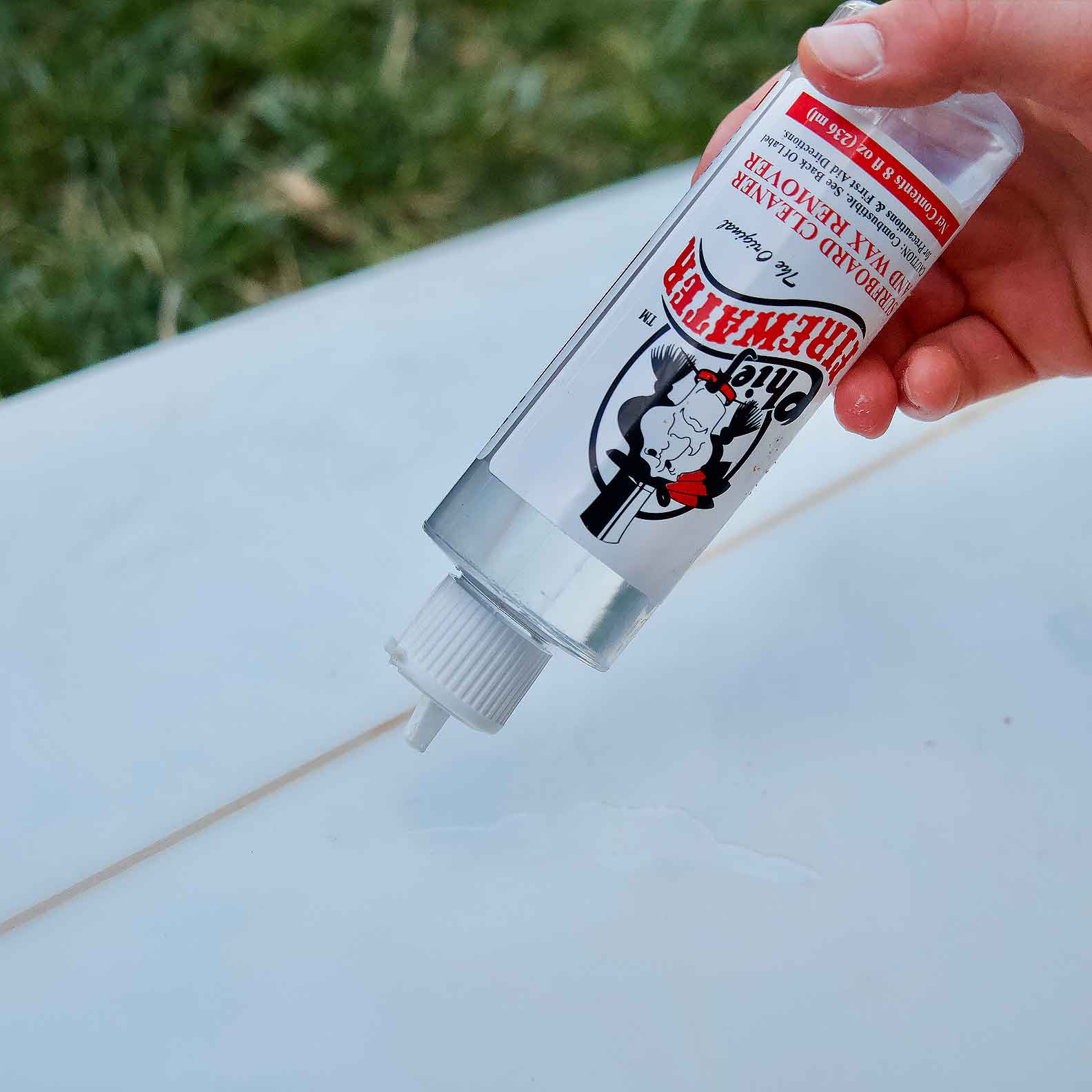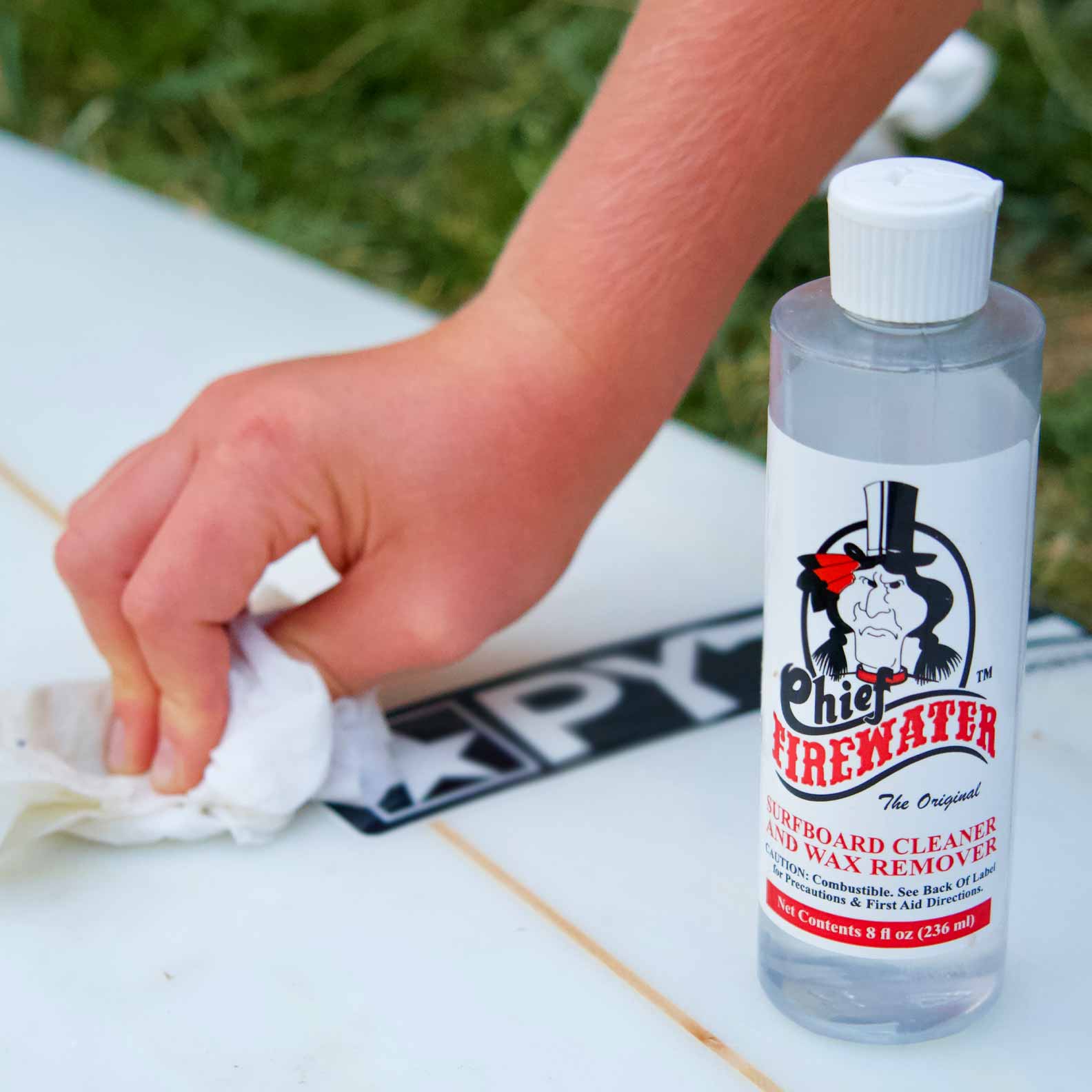Removing surfboard wax has never been easier and cleaner than with Chief Firewater, an exclusive citrus based formula. It is available in 8oz bottles and in 1 gallon bottles.