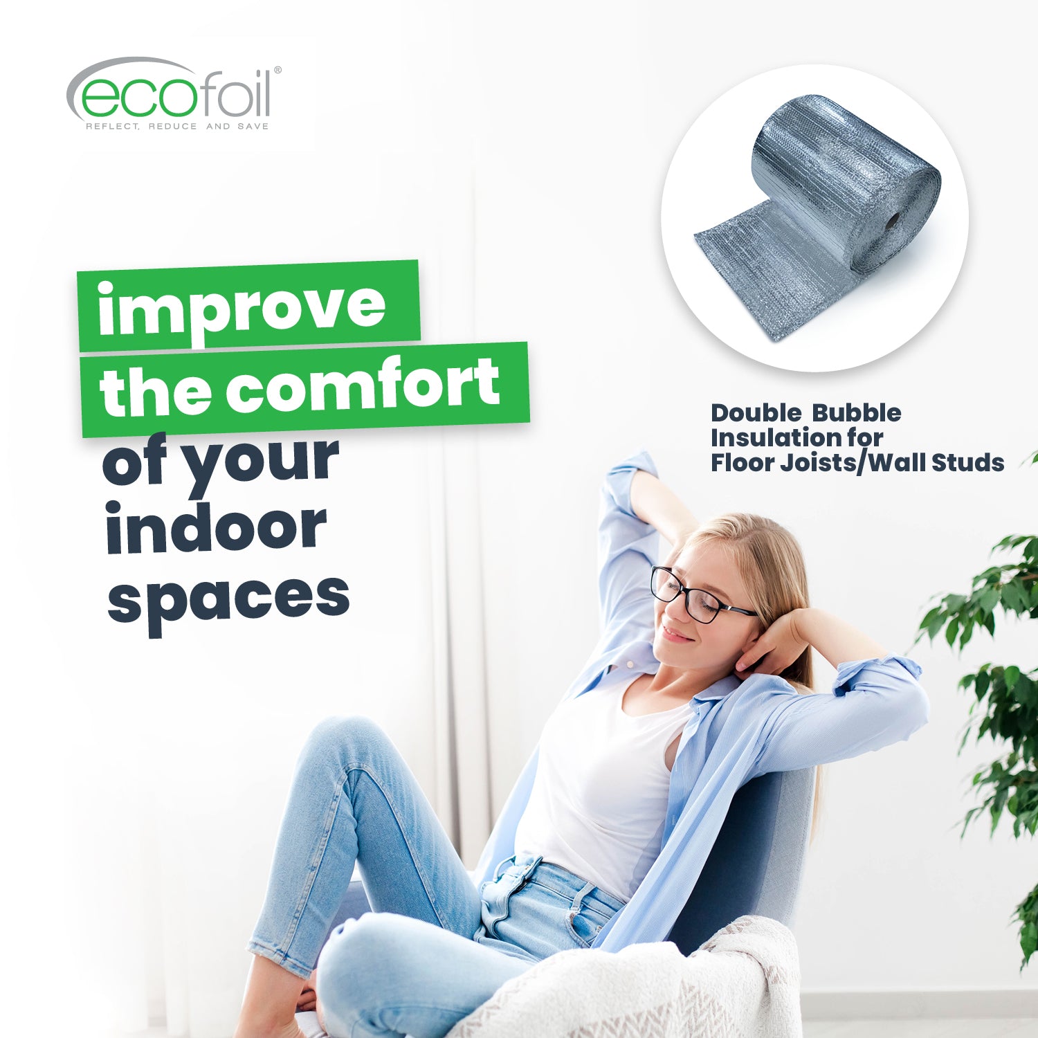 EcoFoil Floor Joist Insulation is constructed of a double layer of polyethylene bubble insulation bonded to two radiant barrier metalized sheets. This (1/4" to 5/16") thick insulation provides superior protection against radiant heat transfer and also provides an effective vapor barrier, preventing condensation which can cause mold. Bubble insulation is rated by its high reflectivity of 96%, and low emissivity of 4%. This means only 4% of radiant heat passes through the insulation. Simply put the insulation is not trying to slow the way heat passes through it, the insulation is trying to eliminate heat from passing through it.
