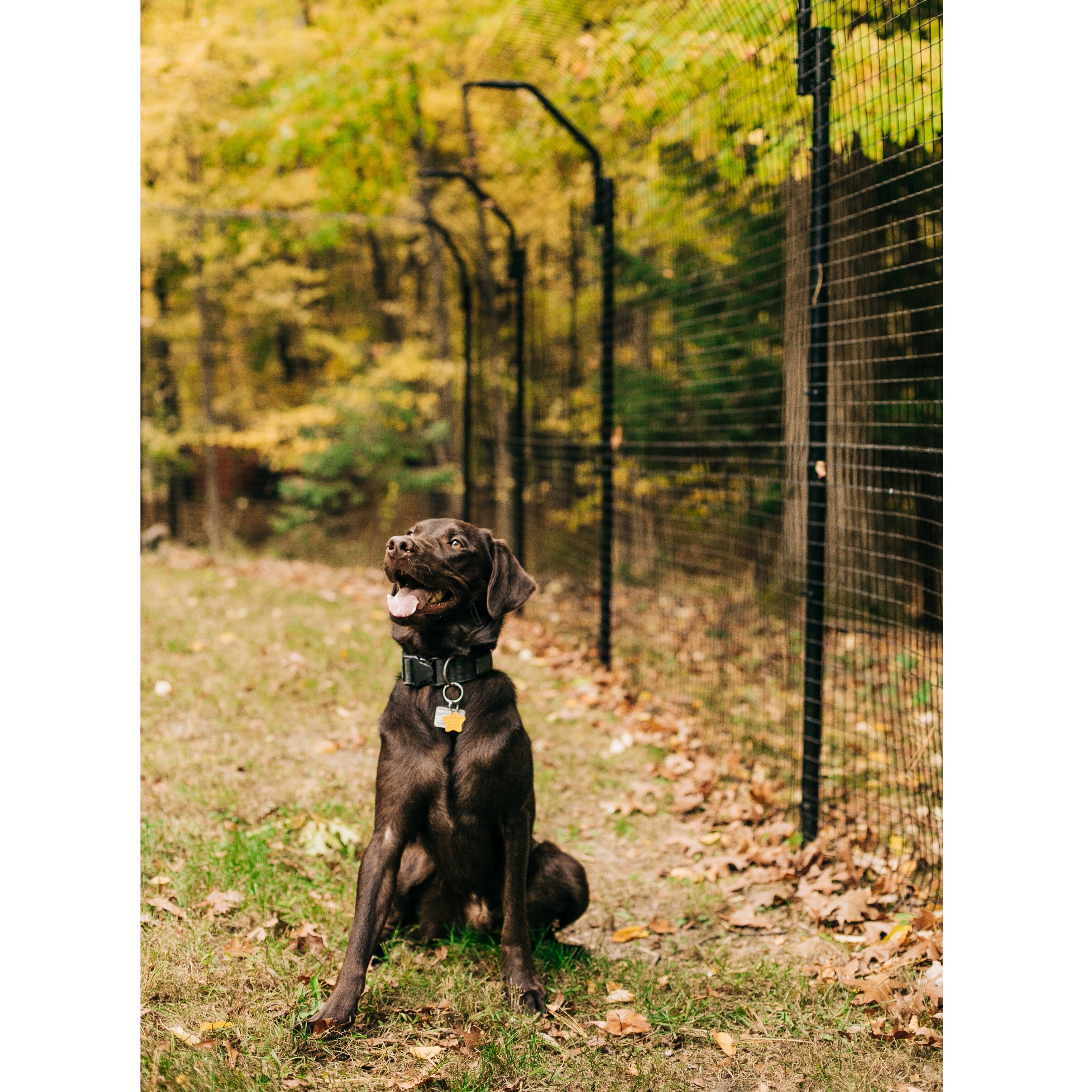 All of the metal components are made of galvanized steel for time-tested, long-lasting use outdoors. For added protection against every day wear and tear, posts are also powder-coated black. Our 6' and 7' tall versions utilize heavy-duty 1 5/8” diameter posts to stand up to even the strongest of dogs. Our 4.5’ tall version for small to medium dogs uses standard 1 3/8” diameter steel posts for ease of installation.