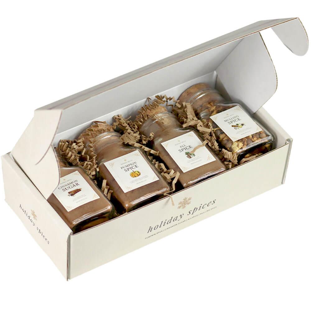Give the gift of spice this holiday! This limited-edition holiday box set comes with 4 small cork jars with your favorite holiday spices: cinnamon sugar, pumpkin spice, mulling spice, and allspice.