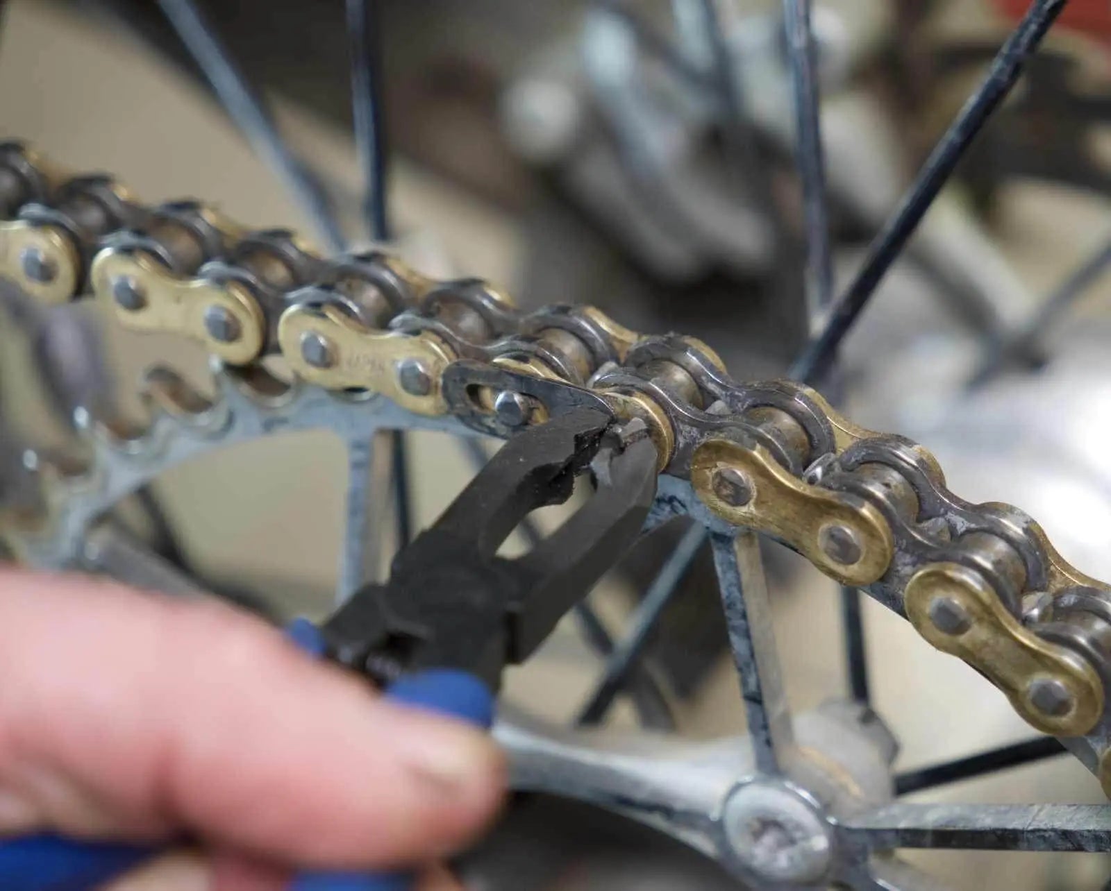 These Japanese-made Hozan P-221 chain pliers are the best and easiest to use. Thanks to a small grove, it is effortless to center one jaw of the pliers on the pin while the stepped tip on the jaw grips the clip for easy installation or removal.