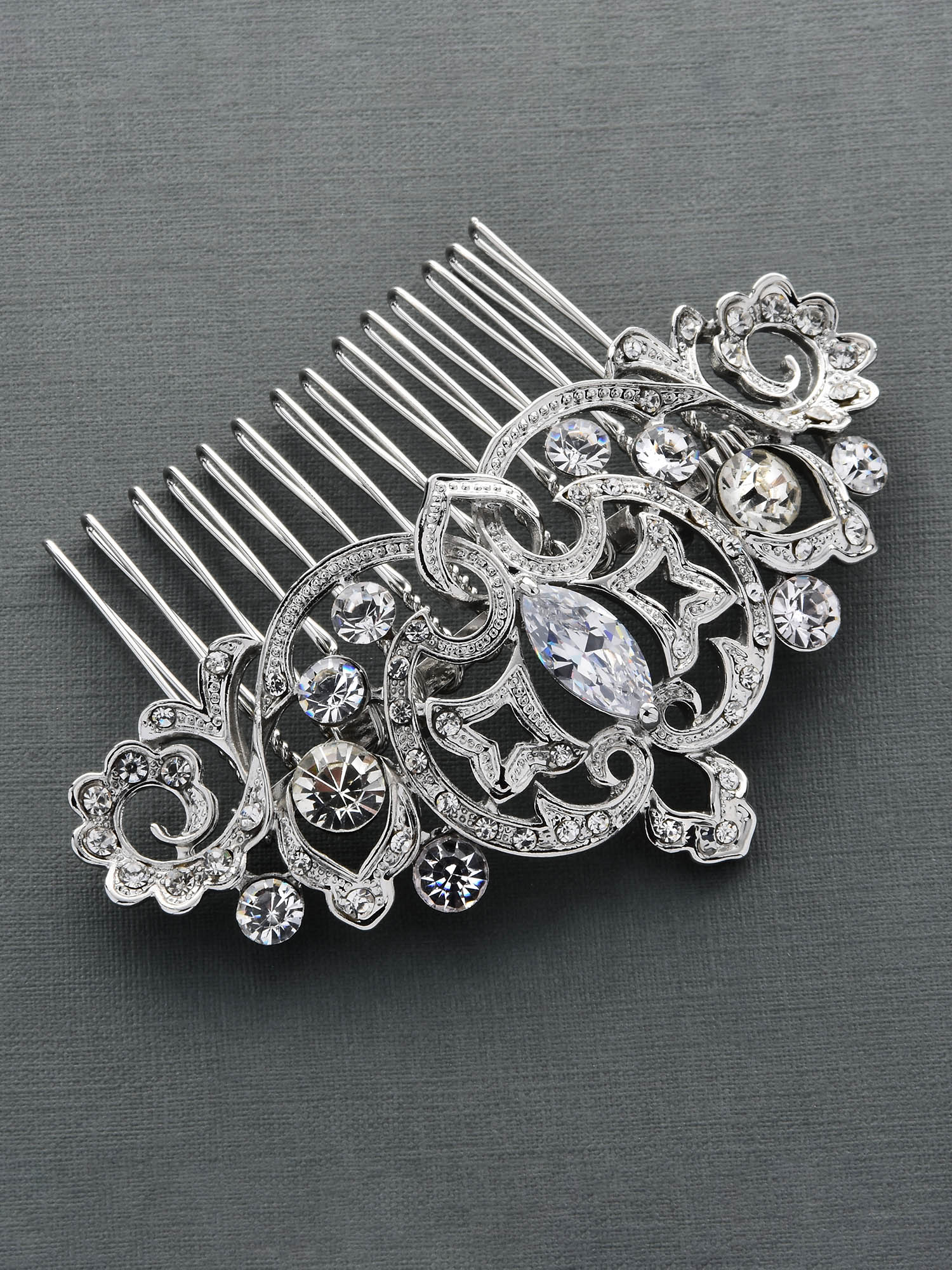 Simply captivating, this feminine comb will dress up your hair with vintage grace. Featuring ornate shapes scrolling around a beautiful, marquise-shaped cubic zirconia stone, this divine hair comb takes inspiration from vintage hair accessories.