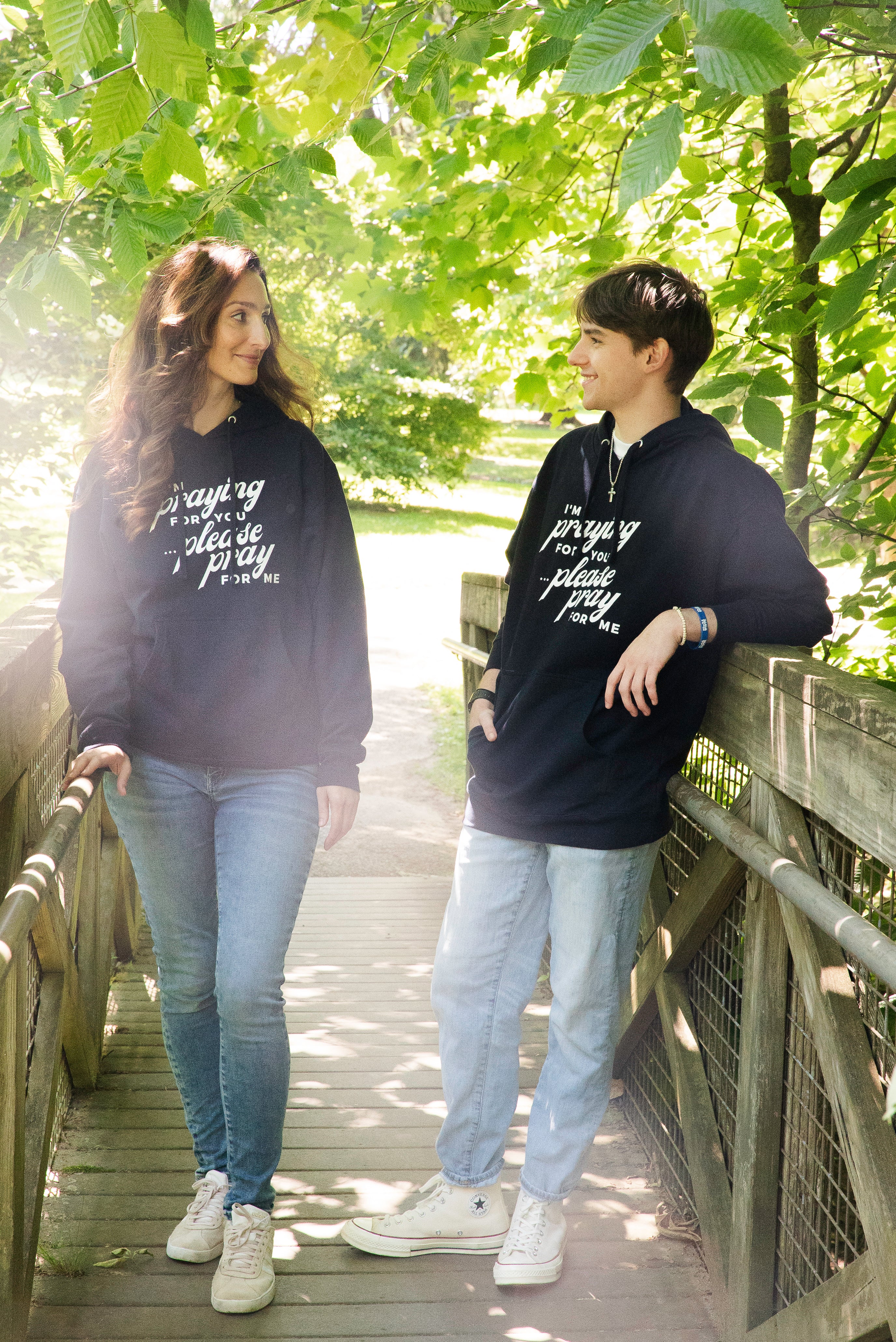 Available in navy blue with the timeless slogan "I'm praying for you, please pray for me” screen printed in gold across the front, this hoodie helps listeners be a beacon of hope to everyone they meet.