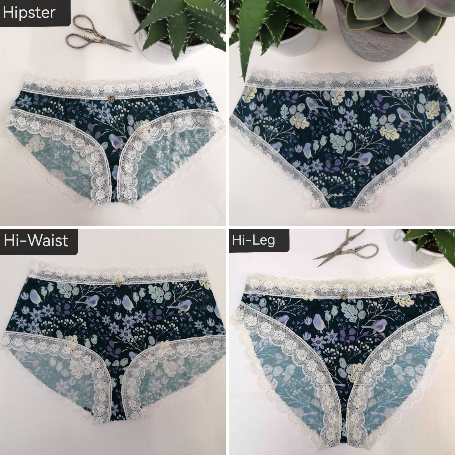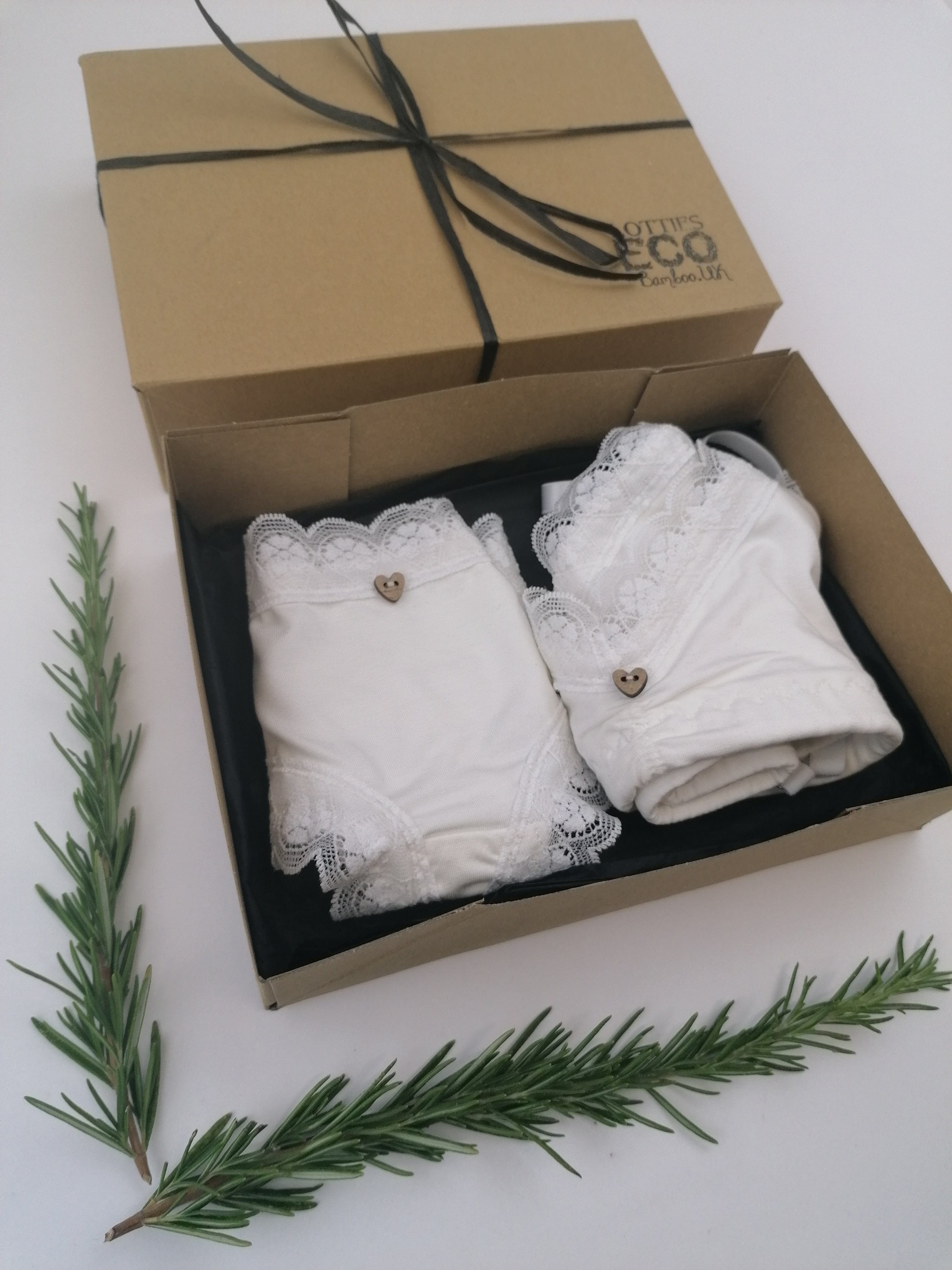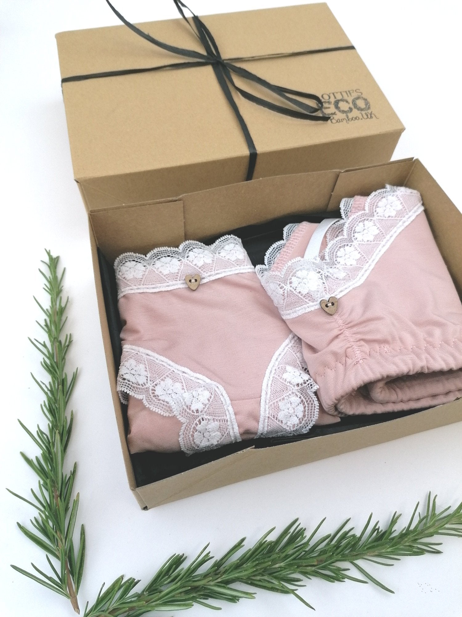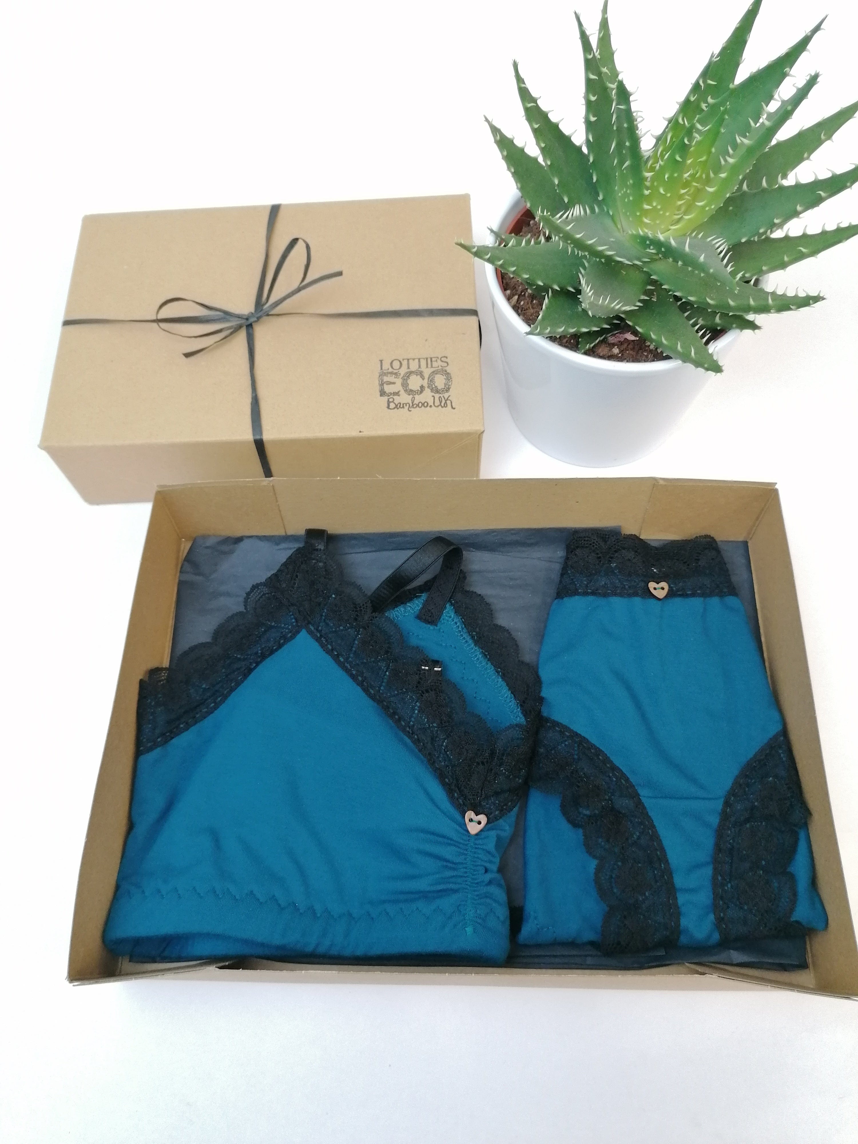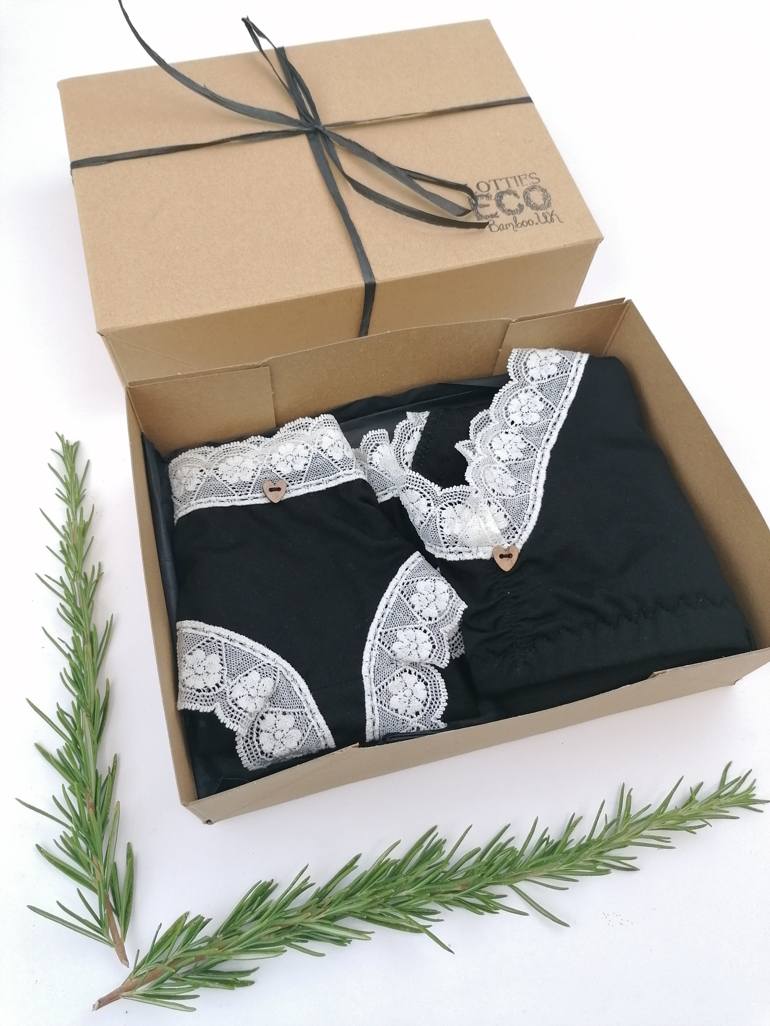 This gift set comes optionally wrapped in tissue paper and in a recycled box, you can choose your knicker shape in sizes XS-3XL. Ours pictures feature our classic low-rise hipster knicker shape. You can also choose from four different shapes from our Hi-waisted short to a Brazilian thong.