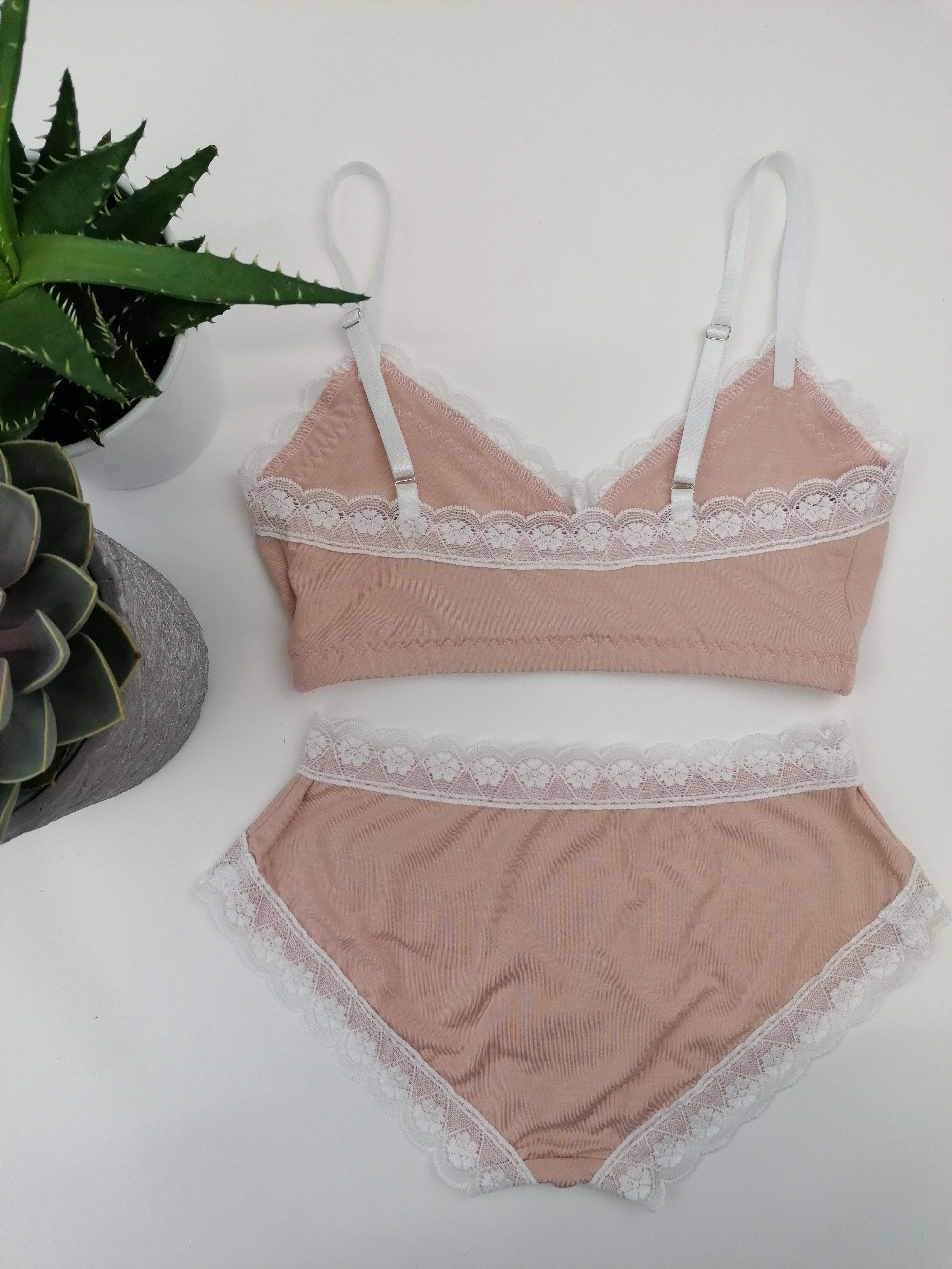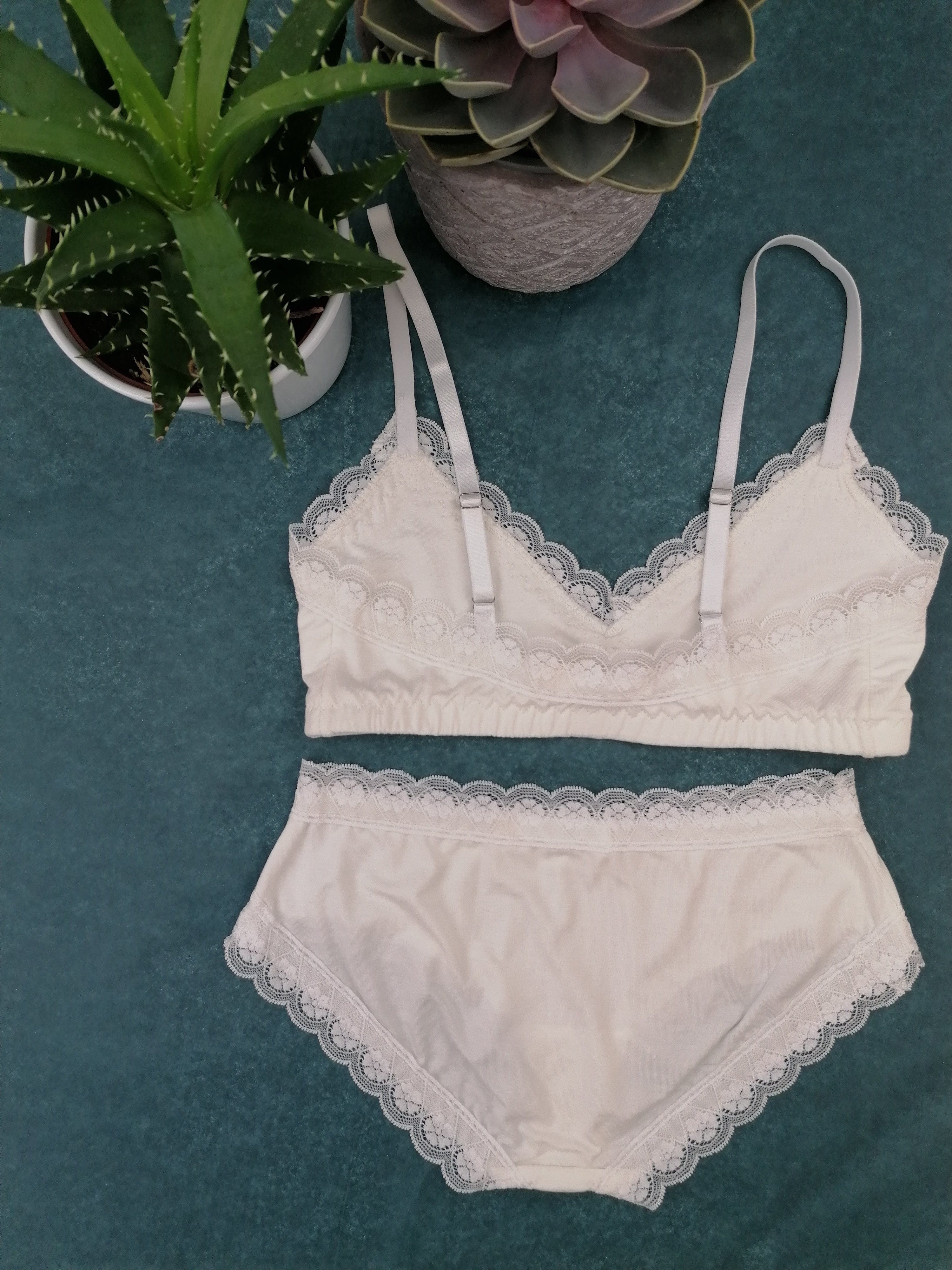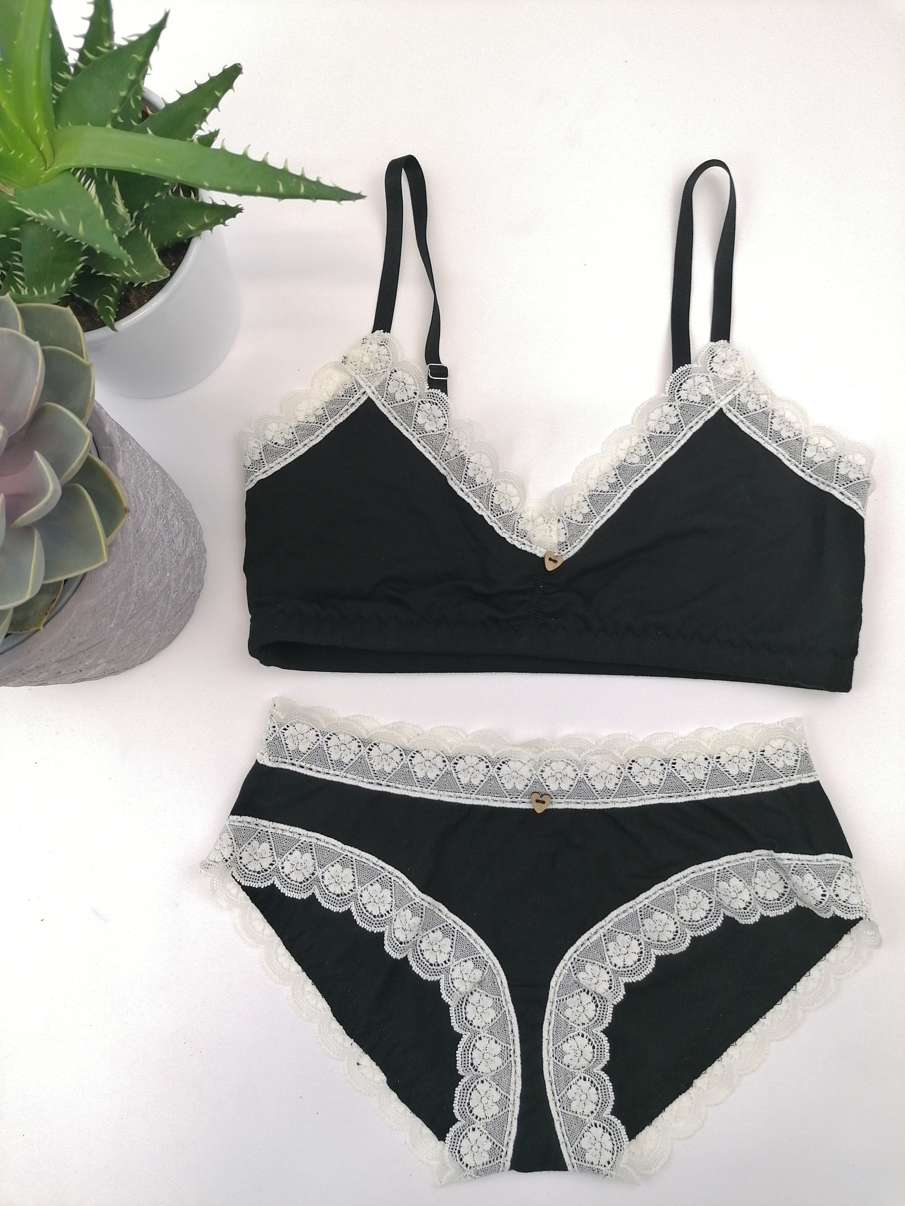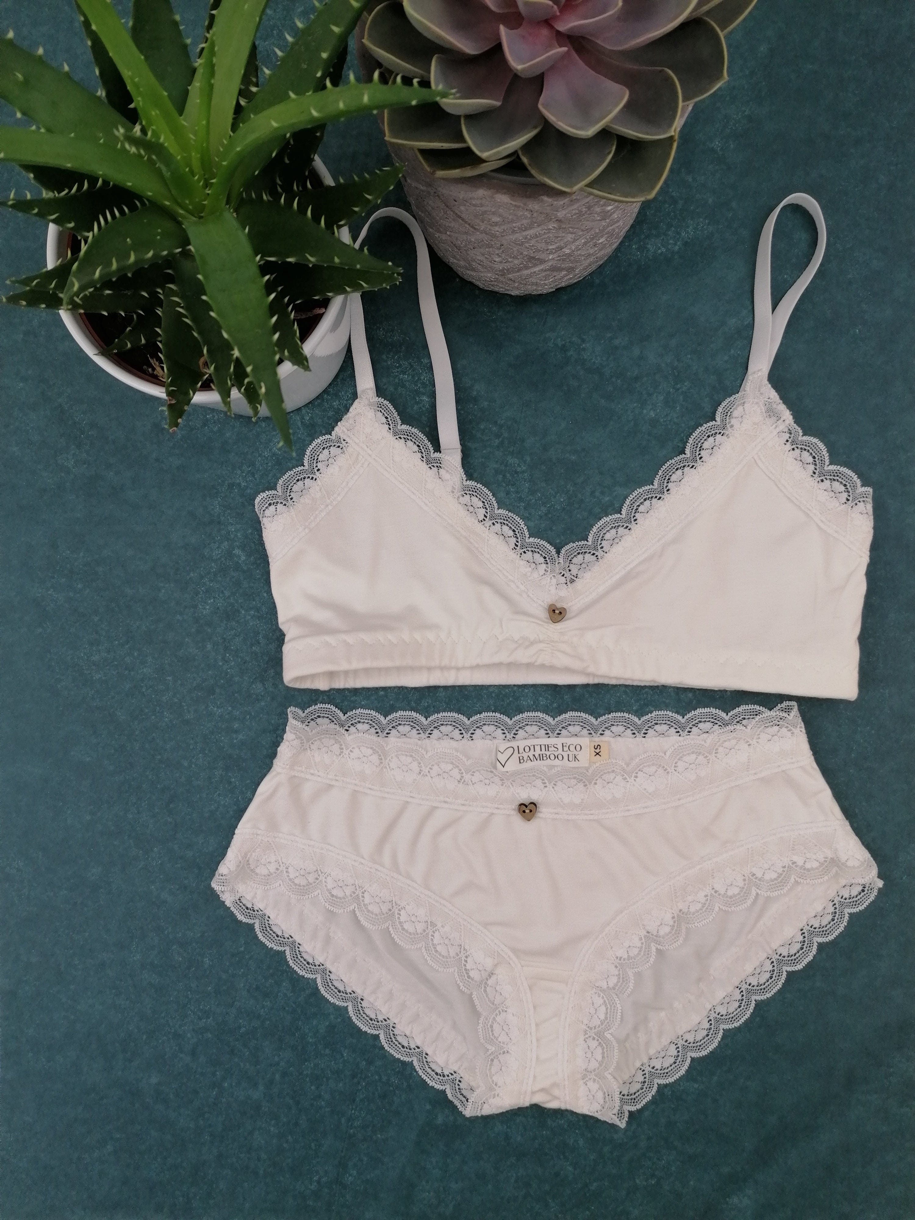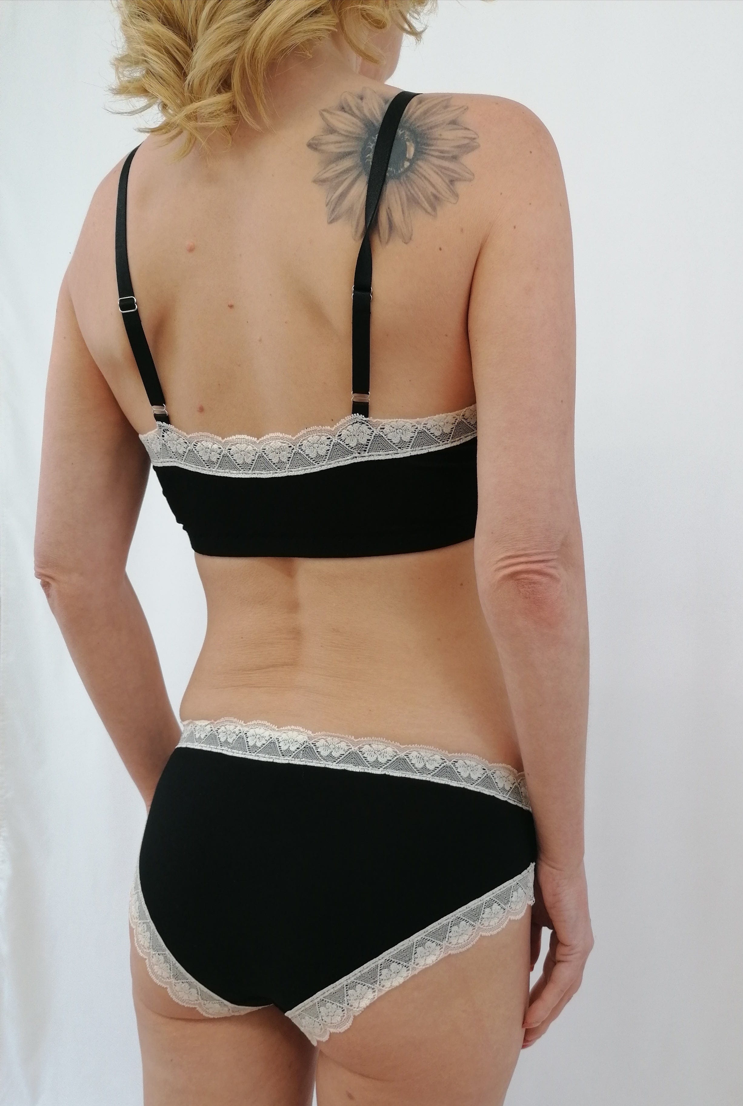 Made from: Fabric - 95% Bamboo Viscose 5% Elastane, Made in China. Lace - Made in Nottingham Poly/Nylon/Elastane mix - upcycled. Heart Button - Made from Coconut Shells