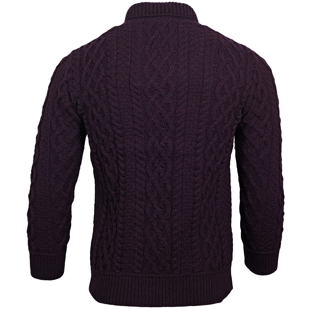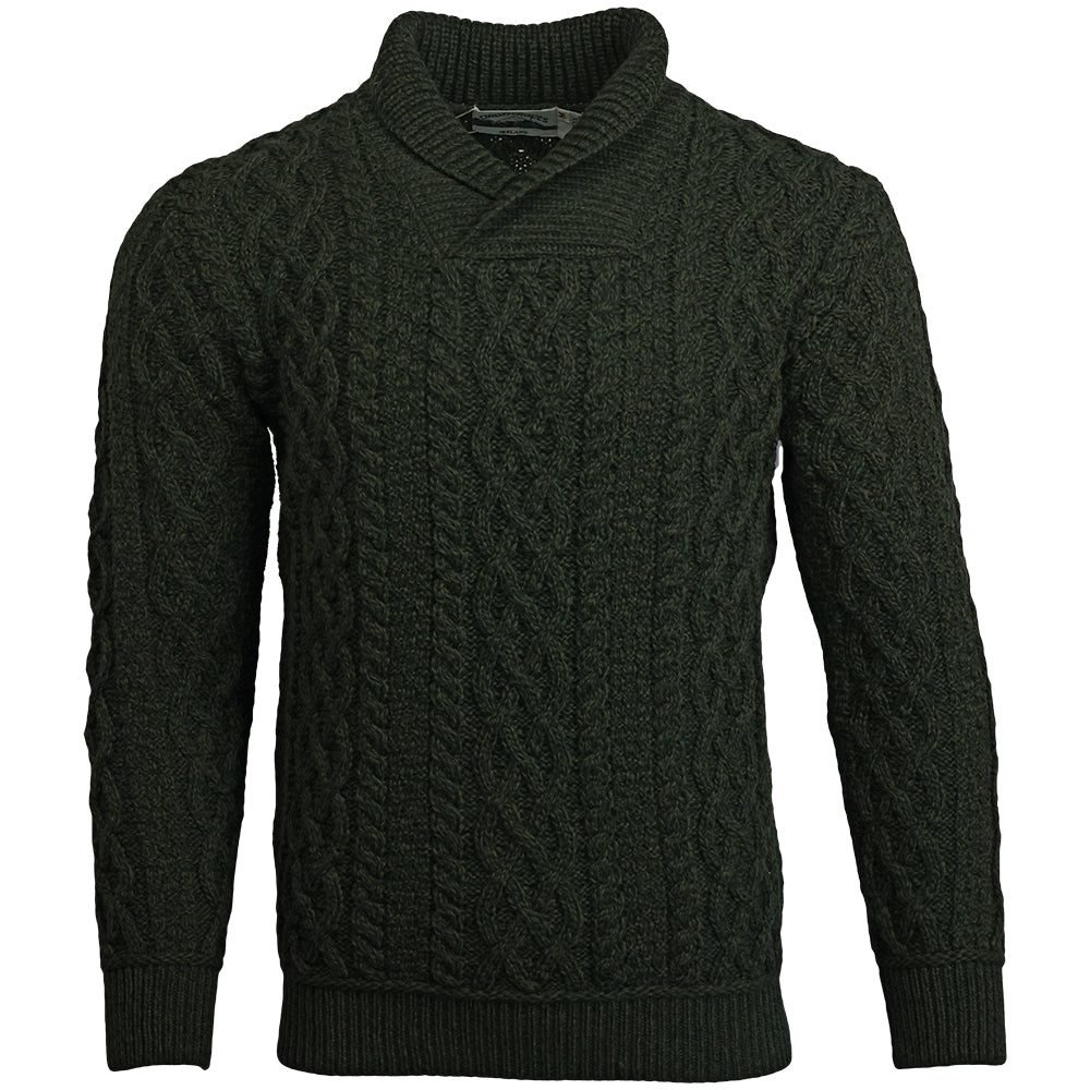 This men's shawl collar cable knit sweater is knit using traditional knitting patterns from Ireland. This traditional Aran sweater features a pattern that combines cables, diamond, and basket stitches as well as a “V” neck shawl collar. The perfect balance of timeless and modern this Irish merino wool sweater is sure to be a your new go to piece for staying warm this winter!