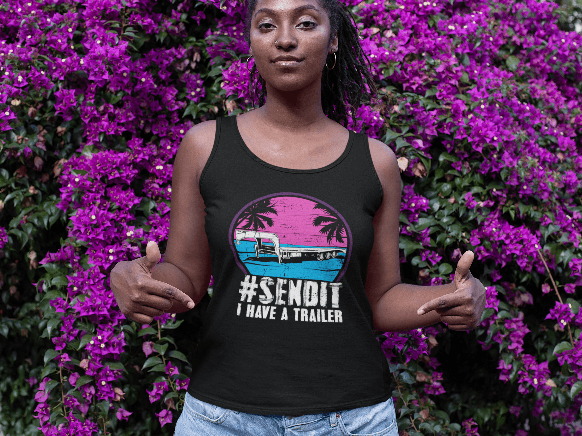 So get ready to turn heads and leave a trail of dust behind you. Whether you're hitting the trails or making a fashion statement in town, our #SENDIT Women's Black Racerback Tank Top is the perfect addition to your wardrobe. Because in the great outdoors, you don't just drive, you Just Send It To The Trailer.