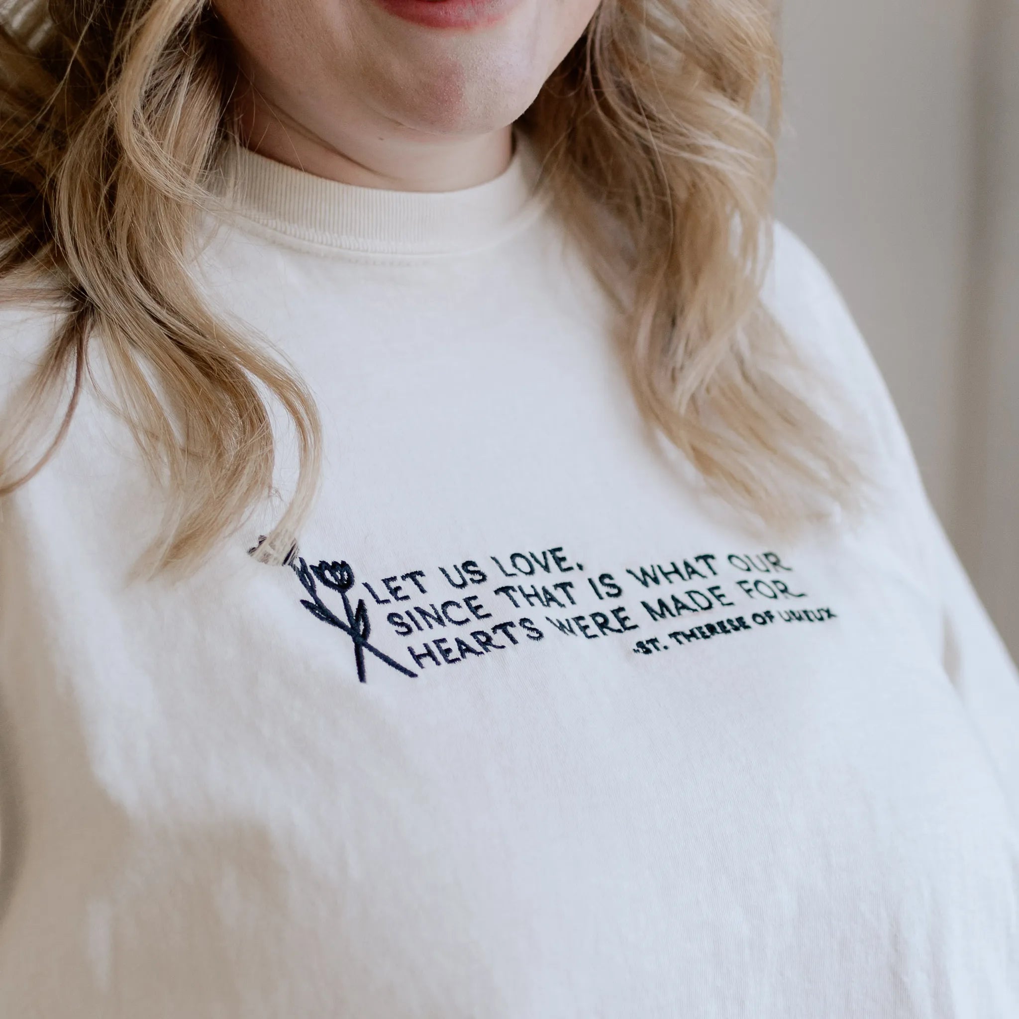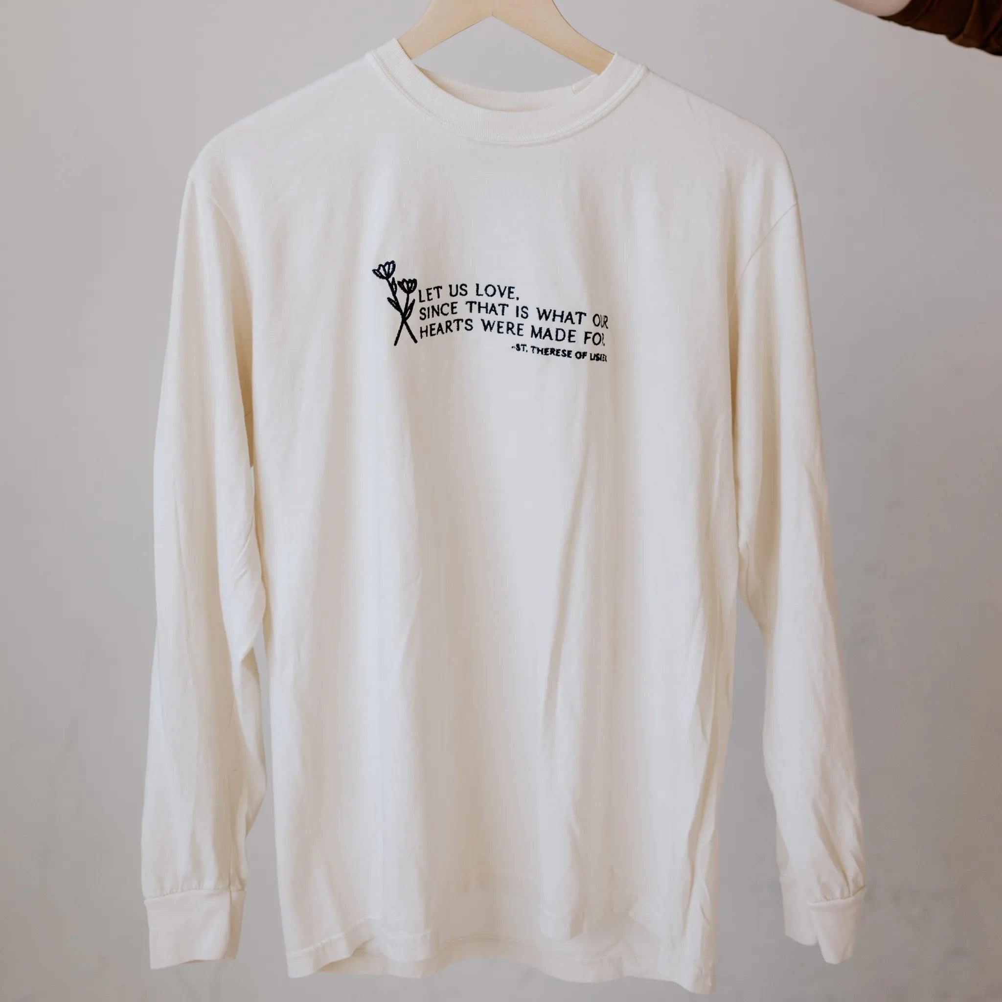 Welcome to a celebration of our faith and femininity with this St. Thérèse of Lisieux-inspired long-sleeve tee. Adorned with a soft-hued palette and intricate embroidery, this tee mirrors St. Thérèse's profound love for God and her dedication to spreading kindness and compassion—reminding us to stay true to the nature of our hearts and let ourselves love, since that is what our hearts were made for.