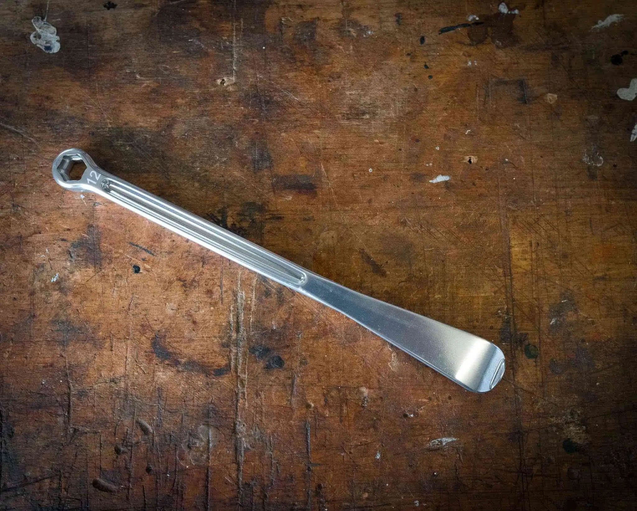 The aluminum Rolling Mavericks T6 Combo Tire Levers may be lightweight but are heavy-duty tire-fixing tools. This tool combines a wrench to loosen the axle or rim lock nuts and a tire lever to spoon the tire off the rim to fix a flat.